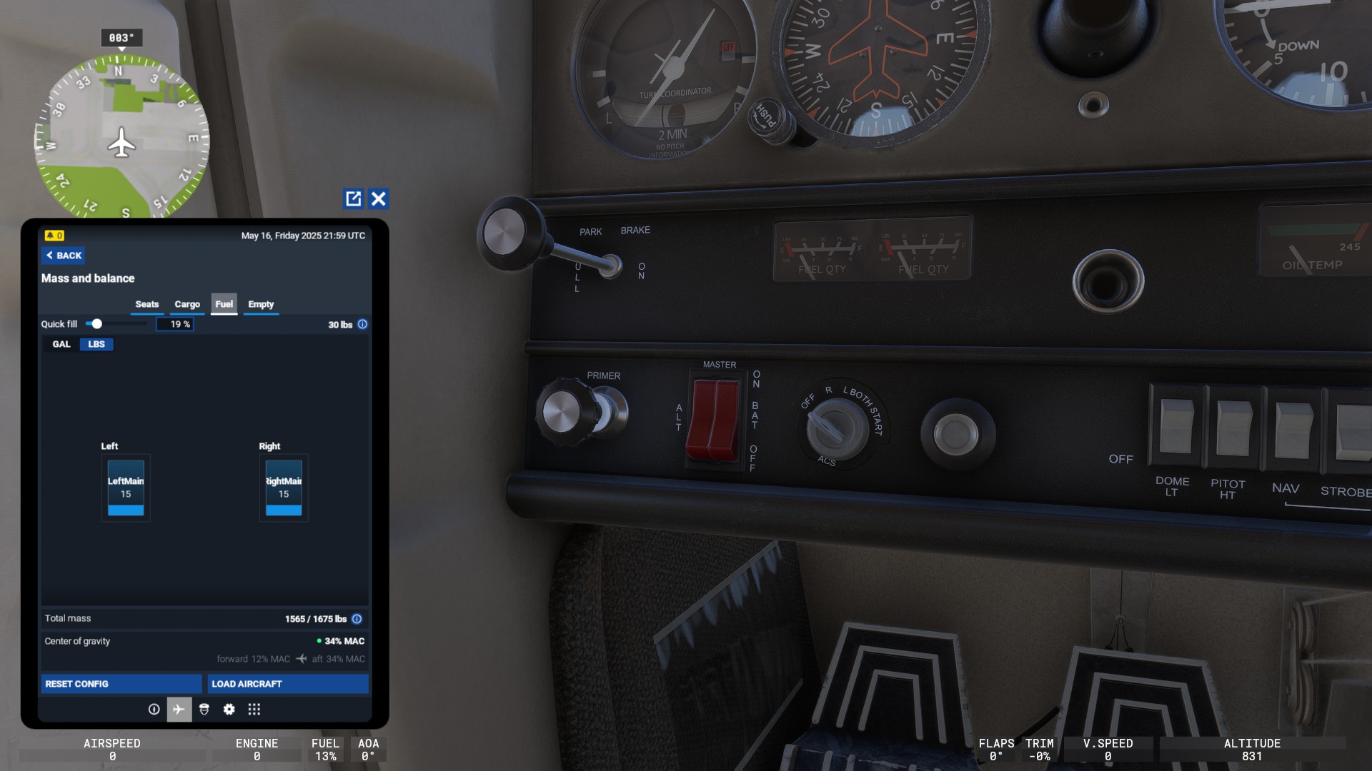 EFB shows 19% fuel remaining, HUD shows 13% fuel remaining.