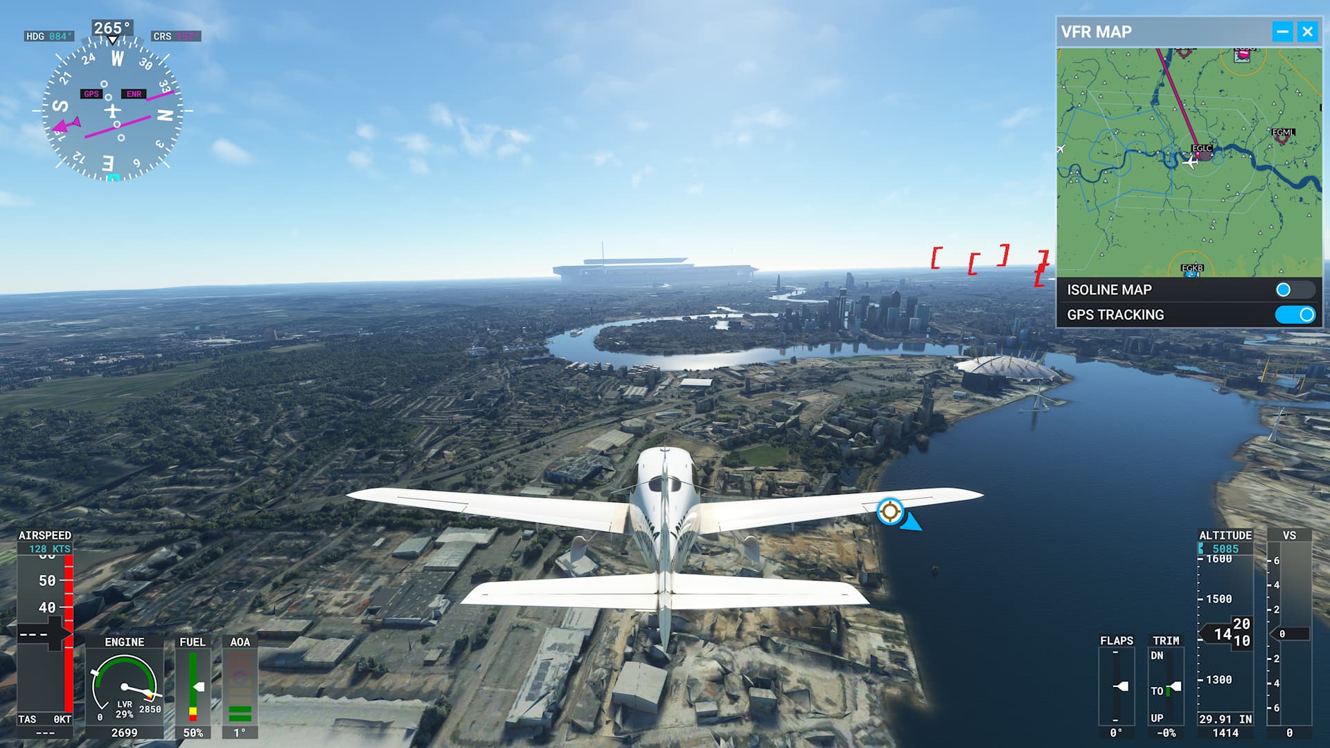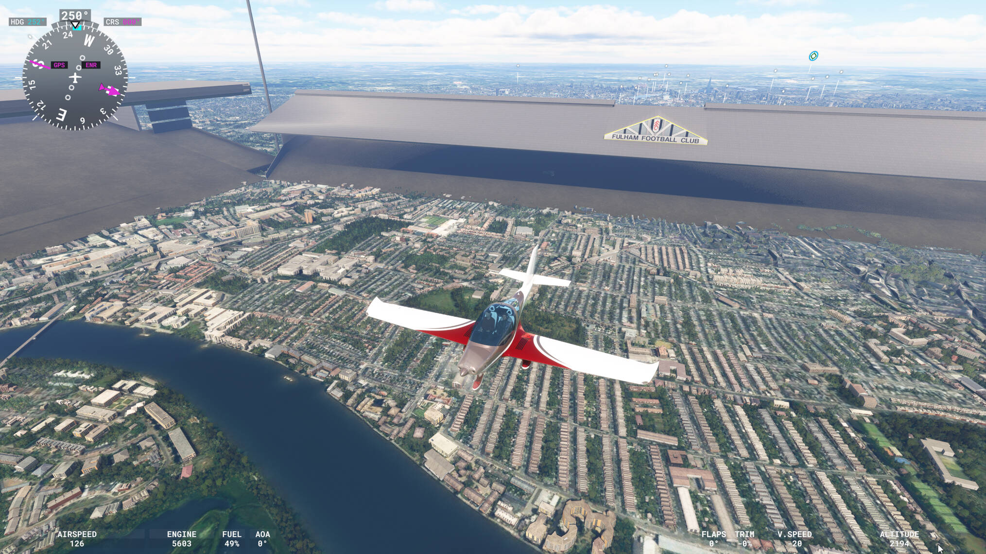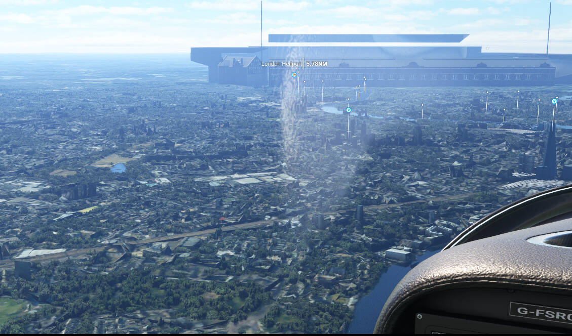 flying over London, the Fulham FC stadium becomes huge at certain view distances. It shows up when flying from redhill north towards London heli port