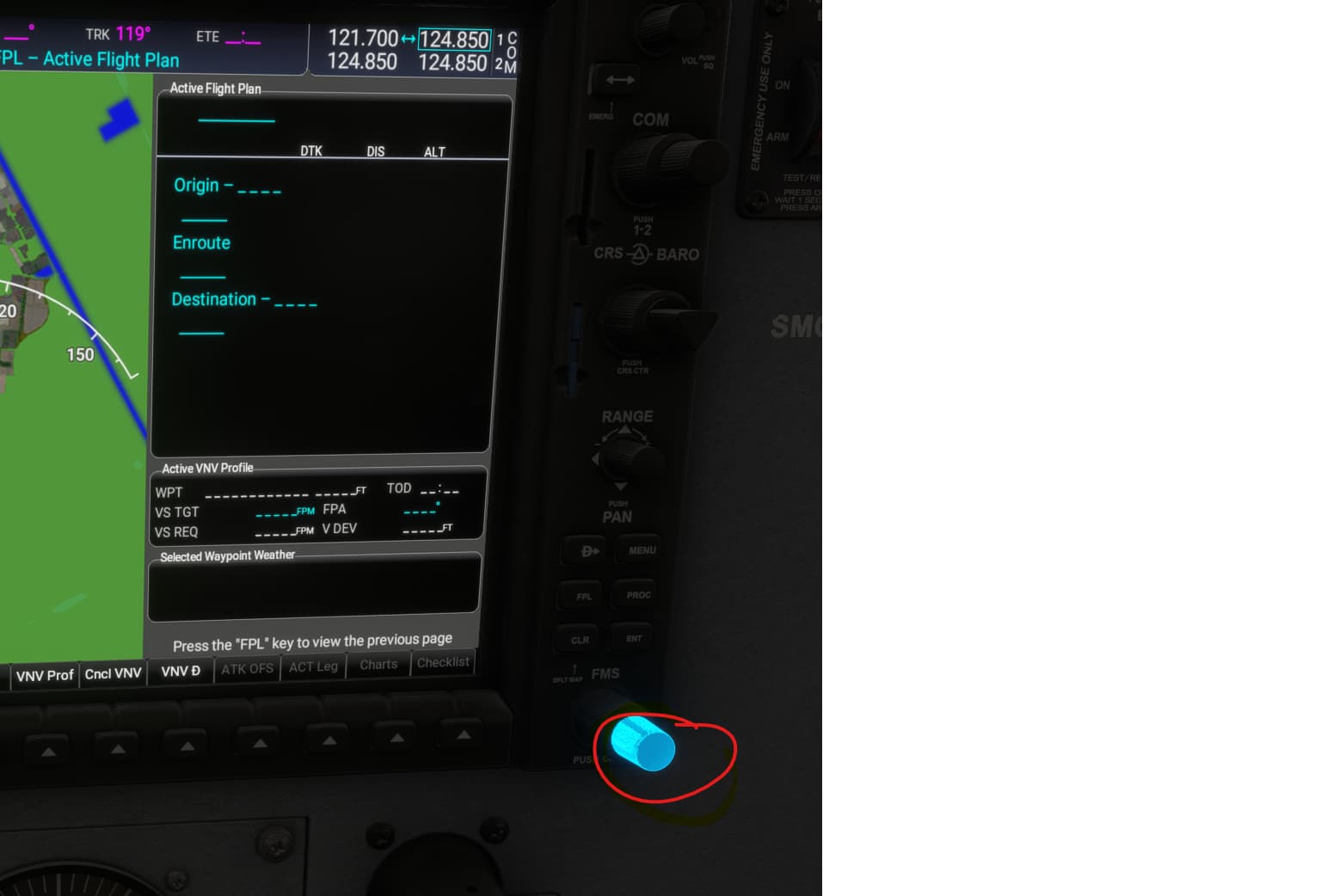 I take back my contribution to this bug. I discovered that simply right-clicking the FMS knob acts as the push function (different than fs2020).
