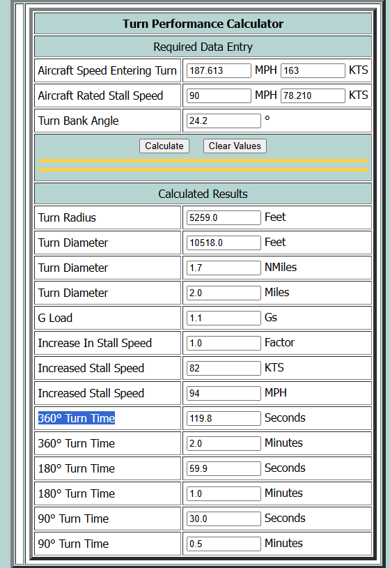 Here you can see the plane in a 24° bank at 163 knots true. The turn indicator shows a turn rate of 2.74°/s or around 2.19min/360°.