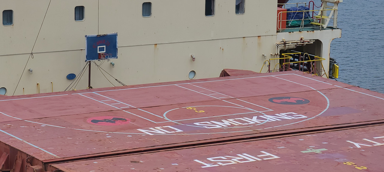 The ship has a basketball hoop setup on hatch 5’s cover with the words “Covid 21” on the backboard, and two Bacardi Rum emblems painted on the deck. I figure the crew must have had a hell of a New Years party in 21, probably while confined on the ship due to quarantine.