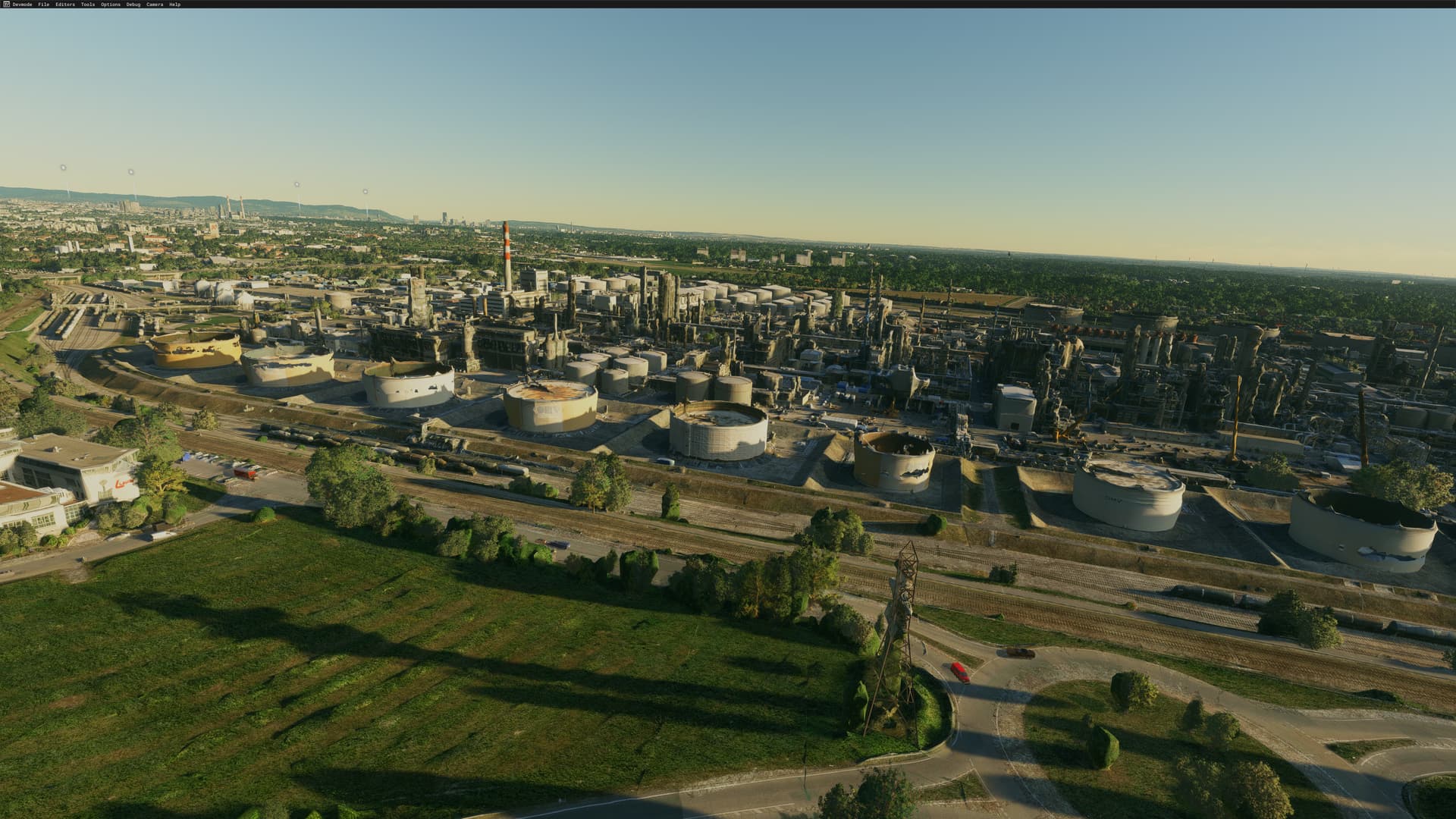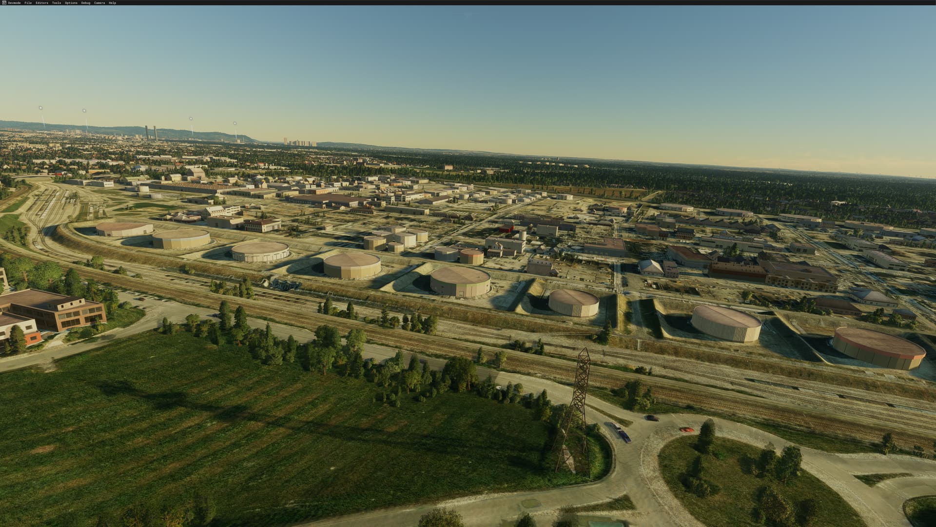 Asobo autogen buildings are visible at the Petrochemie factory just before RWY 11 at LOWW. They cut into the custom Gaya LOWW 3d models. The Asobo models disappear if Photogrammetry is turned on. You need to have Gaya LOWW installed to see this.