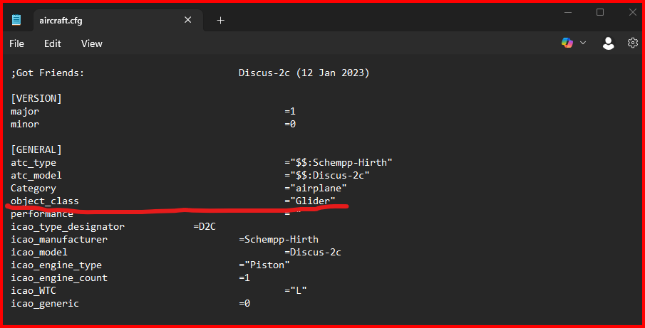 In the Got Friends Discus 2c aircraft .cfg file I added the following line under [GENERAL] just below “Category”: