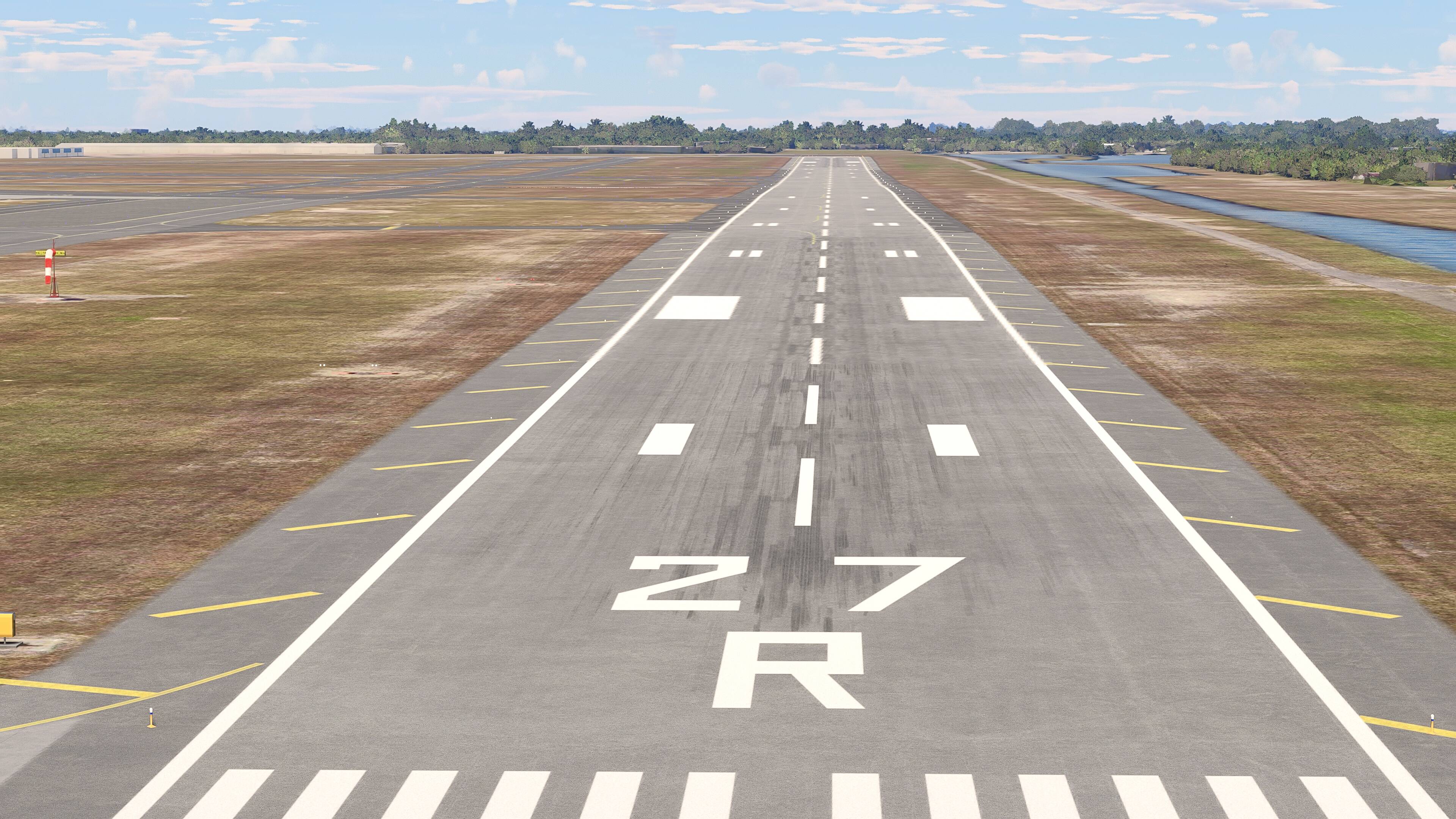 Coming in closer on the approach you start to get trees across the water. Also notice the black tile edge through the middle of the runway. ![]()