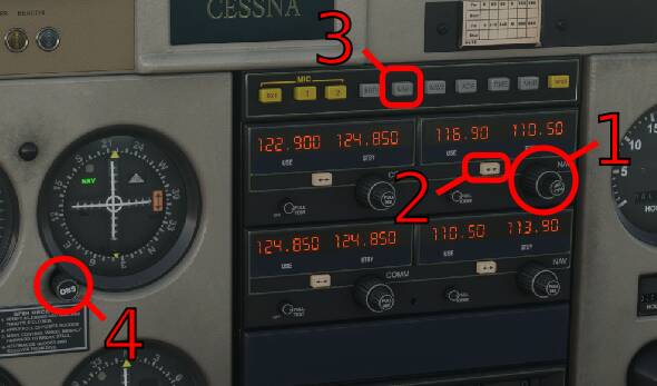 - With this knob you may change the frequency (by turning the inner and the outer knob) as well as switch between NAV 1 and NAV 2.