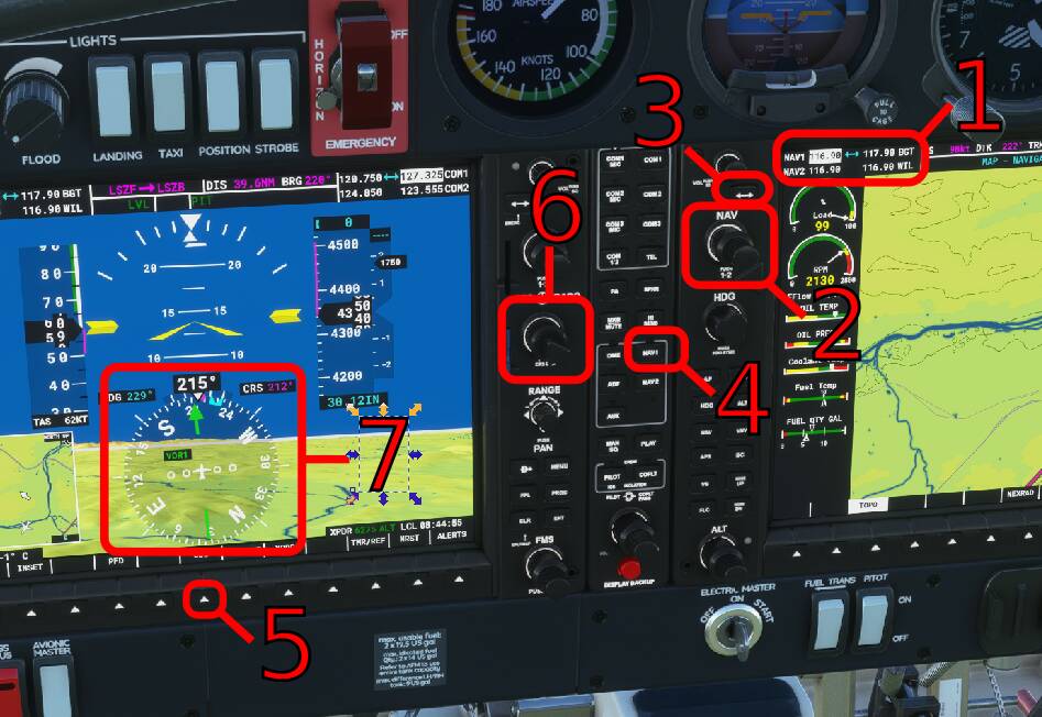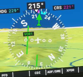 - You may now switch the navigation mode to VOR1 by pushing the CDI button as many times as needed. The indicator (7) will be of a green color.