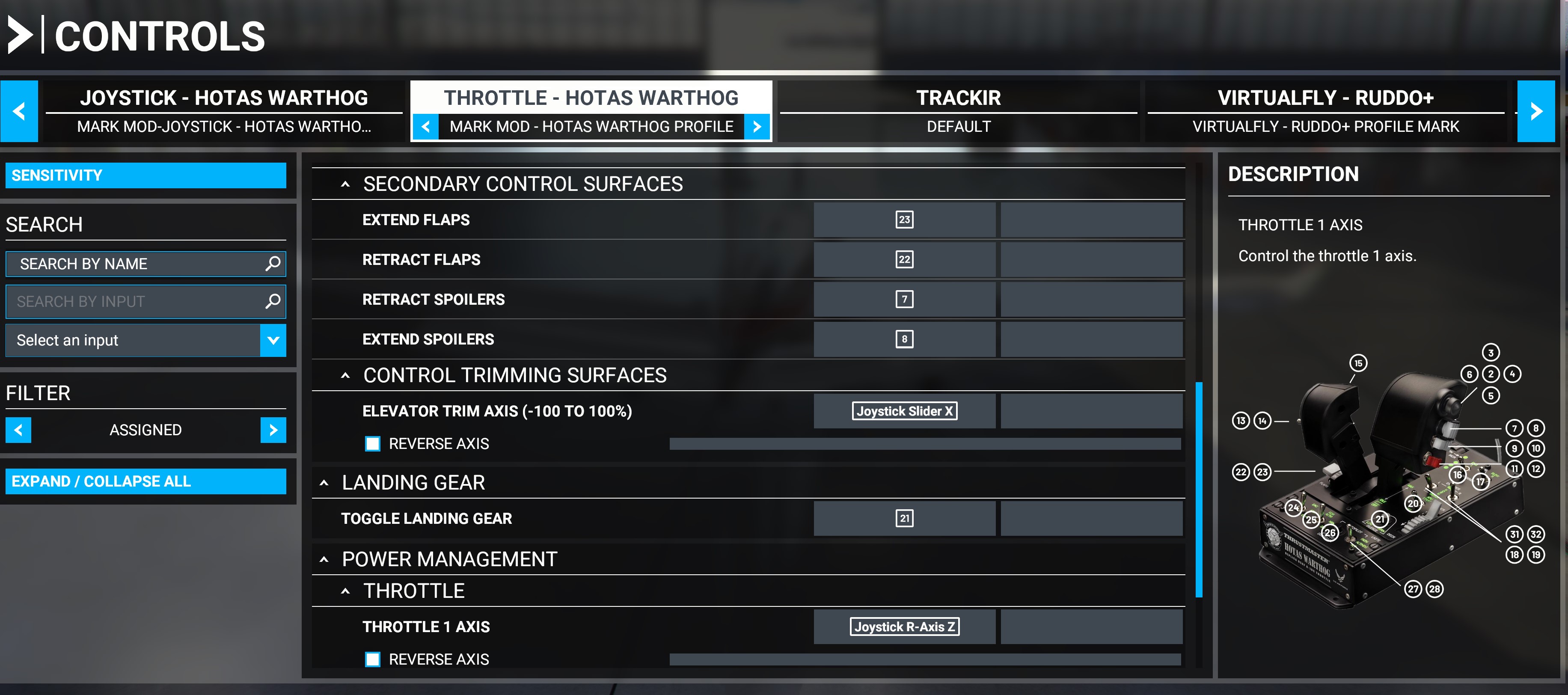 Hi, some good advice above. I’ll add that like you, on the Hotas Warthog Throttle not much was mapped in MSFS, unlike the Stick. I’ve done similar to others in mapping some things in MSFS. I have another throttle I use for GA aircraft, but some things I was really missing was the ability to use speedbrakes, toggle landing gear without using a keyboard, and adjusting trim with a wheel-like control. I got all those mapped nicely on the Throttle (the slider on the right is now trim).