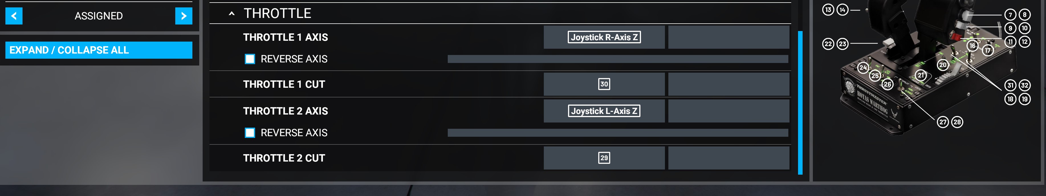 When you look at the tab for your throttle within Options/controls, there should be a picture of the throttle. I’ll use their standard numbering to give you an idea of things I’ve mapped (and just as a disclaimer, make sure you’ve filtered to “all” on the left side of the control screen for throttle).