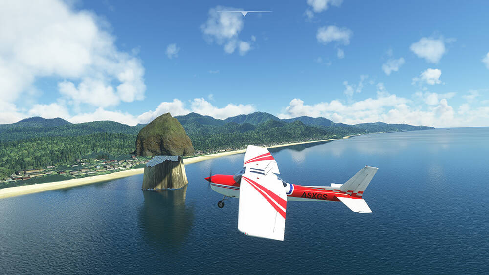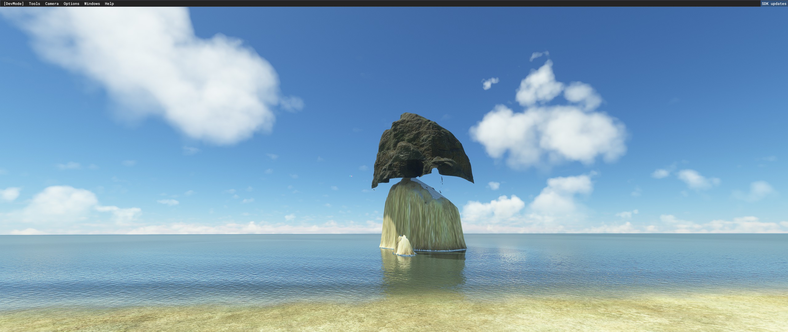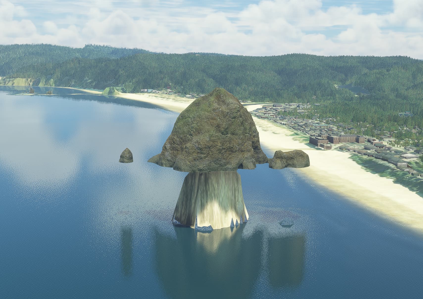 Haystack rock appears perfectly normally and nice until I am within a mile or so of it. Then the top pops off!!! The new detailed mesh just sort of jumps 300ft in the air above exposing the existing low poly rock. Very strange looking as you can see in the picture. It remains this way until I fly away from it a few miles and it lowers back to normal!