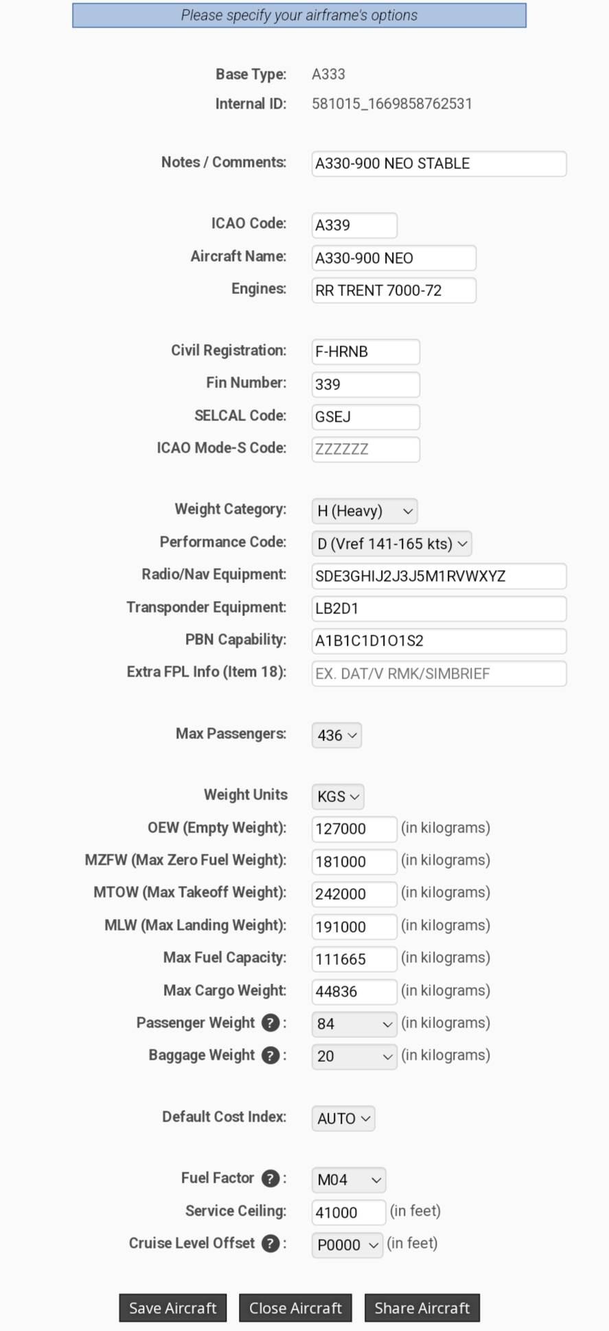 I copied your airframe details and loaded a flight, but same result, when selecting SEND for WB, the max psgr count shows 290, even though the nominated psgr total in the airframe specs was 435.