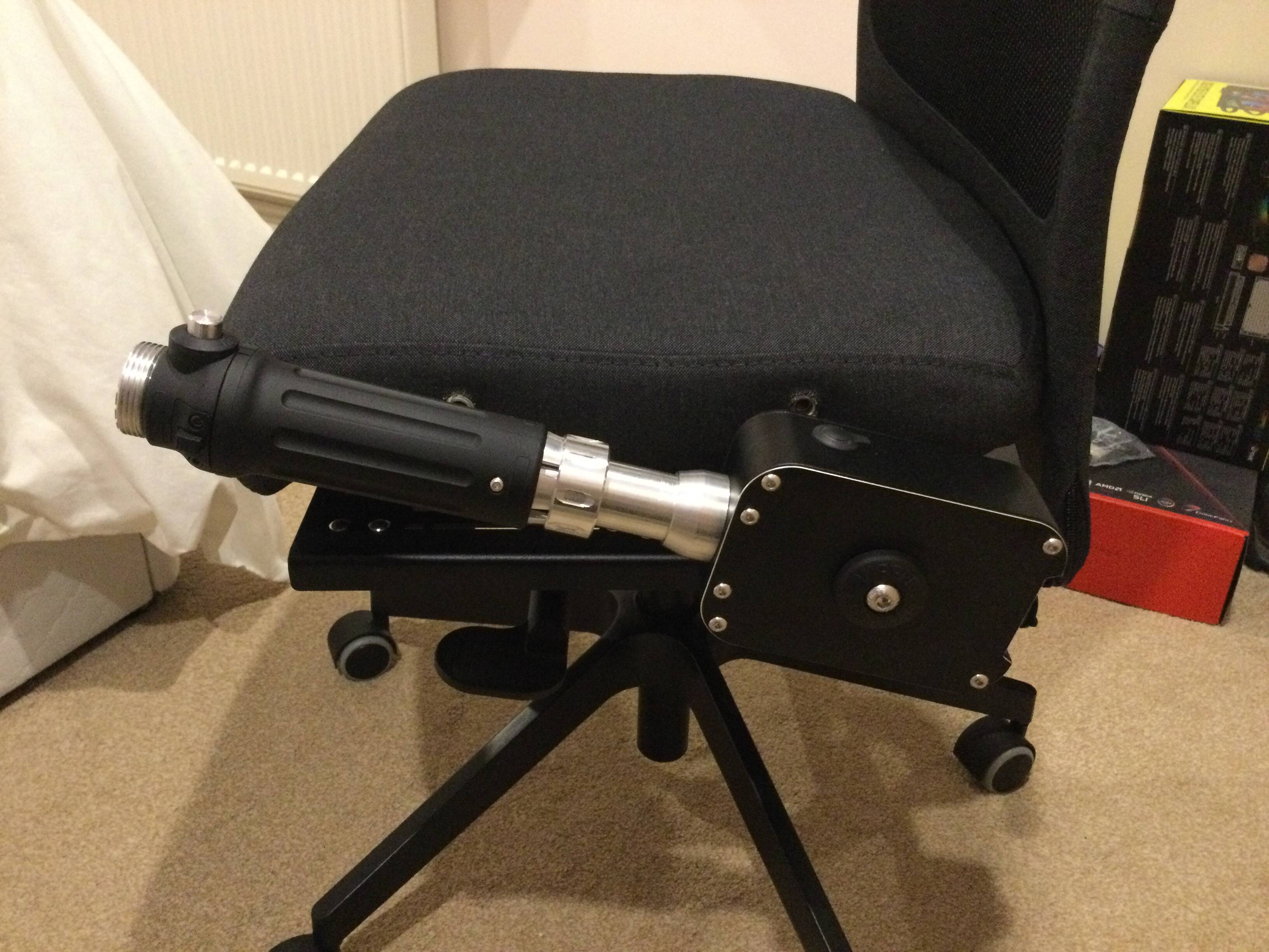 Not the greatest picture, but it shows the collective mounted to the chair where the armrest used to be. I used a MonsterTech mount - very well designed and easy to adjust.