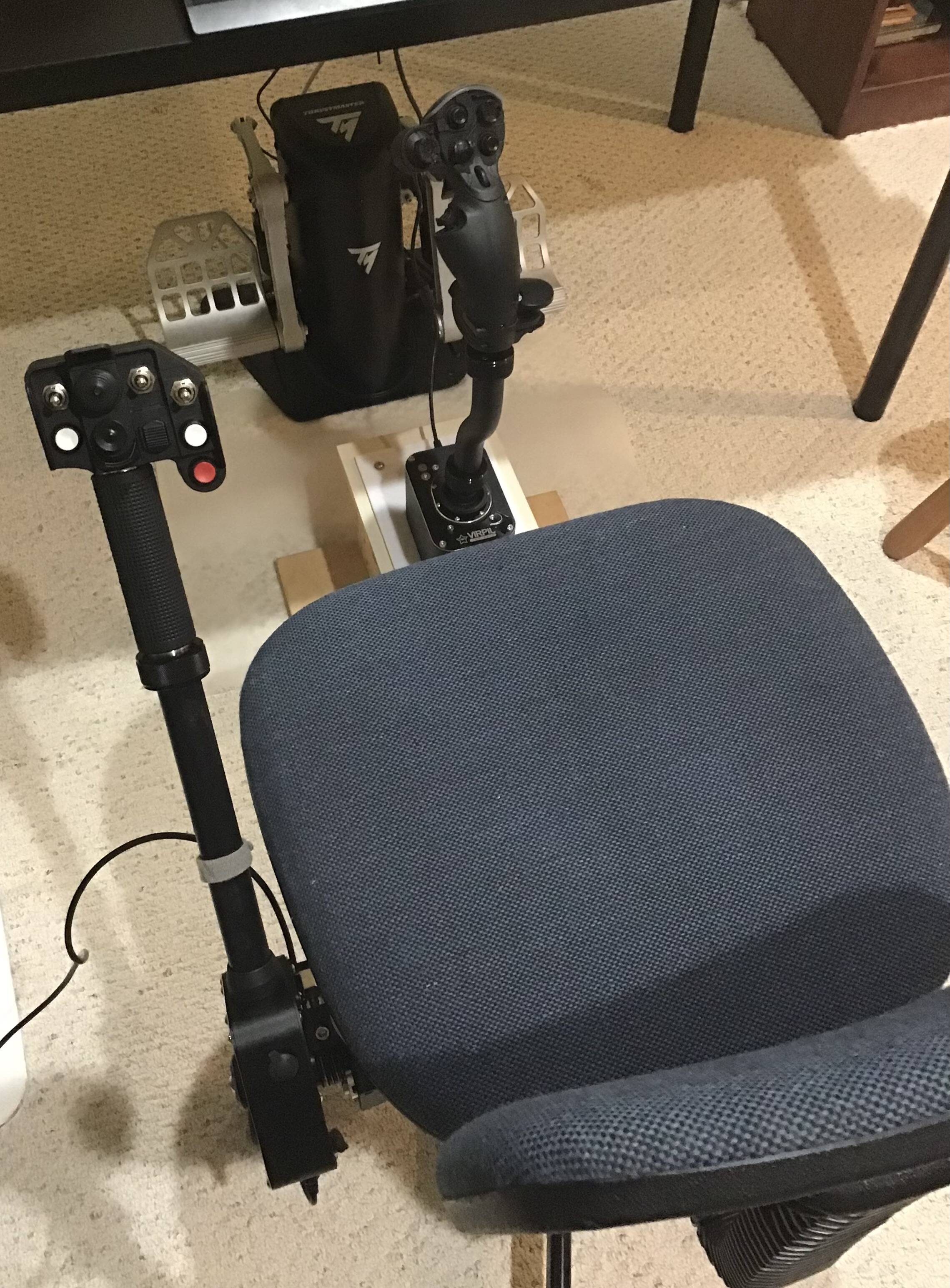 I’d love to have the joystick between my knees, but that puts me way too far away from the desk. It works fine to my right like it is.