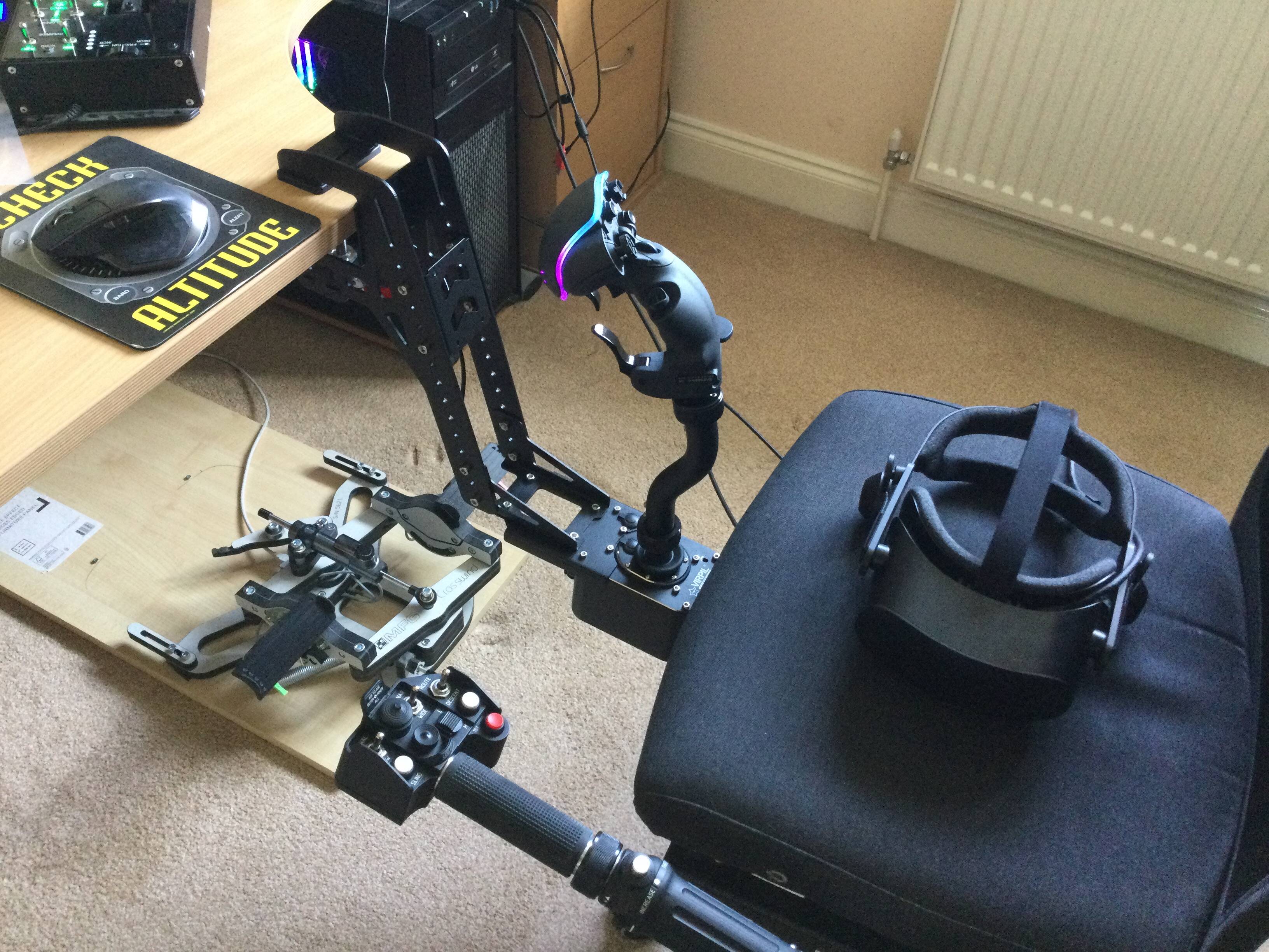 The joystick base/grip is mounted to the desk with a Virpil desk mount. The grip is on a 200mm extension, which gives it very fine control as a cyclic. I could remove the extension and adjust the height of the mount to get quicker response in jets and aerobatic prop planes, but that takes some work, so I just leave it as is.