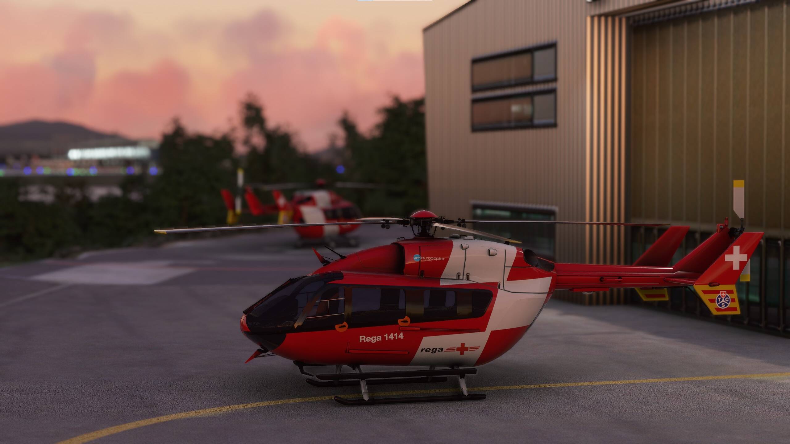 Here: Rega helicopter parked in Zurich Kloten (LSZH), as part of the Zurich Airport scenery add-on (available in the Market Place).