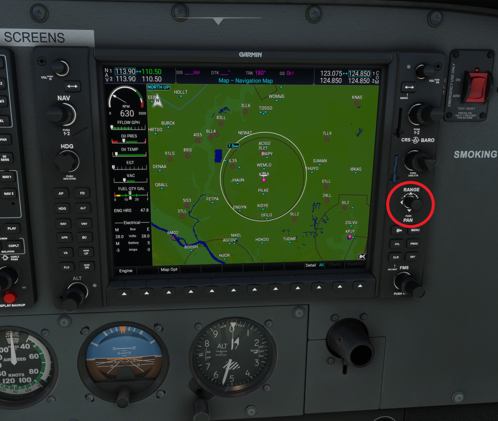 I’ll tell you about panning or you can disregard! If you click on the end of the range button, you can then use the straight arrows (left, right, up, down arrows) to move around the MFD screen. You’ll need to push the end of the button again to exit the panning mode.