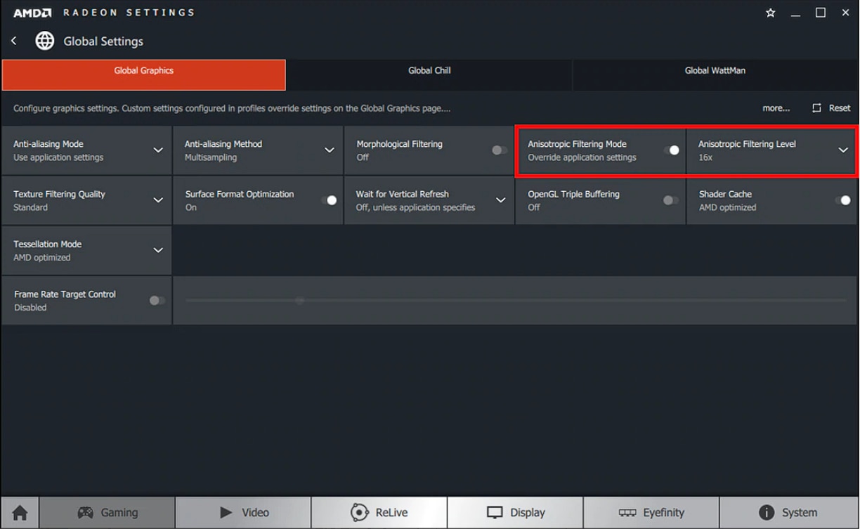 That link says to go to the “Advanced” settings, where the Anisotropic option is.. I see no Advanced option on the Global Display page. Here’s my Global Display page.