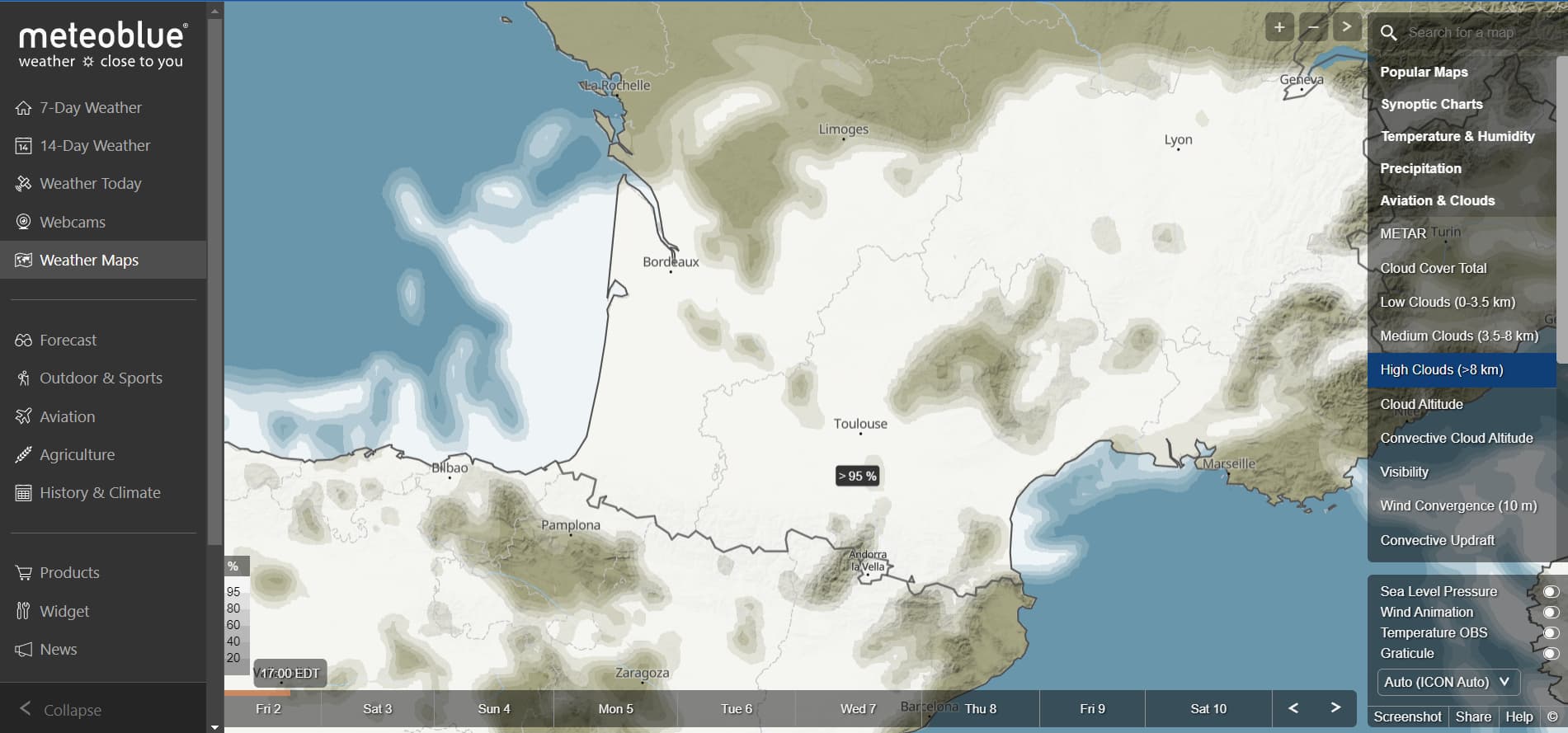 LFBO (Toulouse). Some high clouds present but depiction could be improved and as per MB map coverage should be > 95%, not the case in the sim