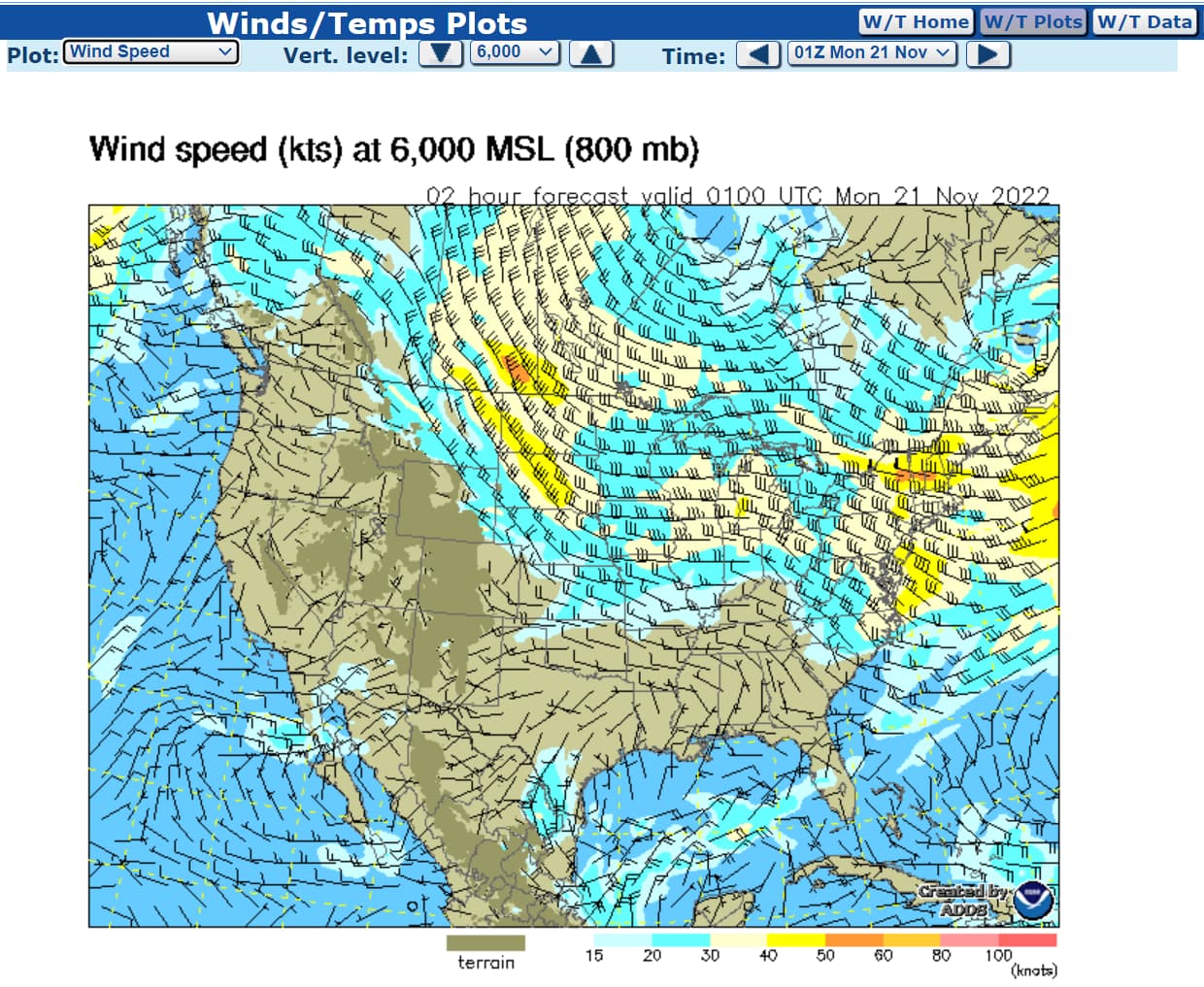 Speaking of winds aloft, the general idea here is that in a no-wind situation you expect a certain amount of time and therefore fuel to fly a particular leg of your route, but if you get a strong headwind it can make you take a significantly longer time to transit that leg with correspondingly higher fuel burn. A winds aloft chart looks like this (with altitude and time of forecast selectable), and there’s also a numerical data version, etc.:
