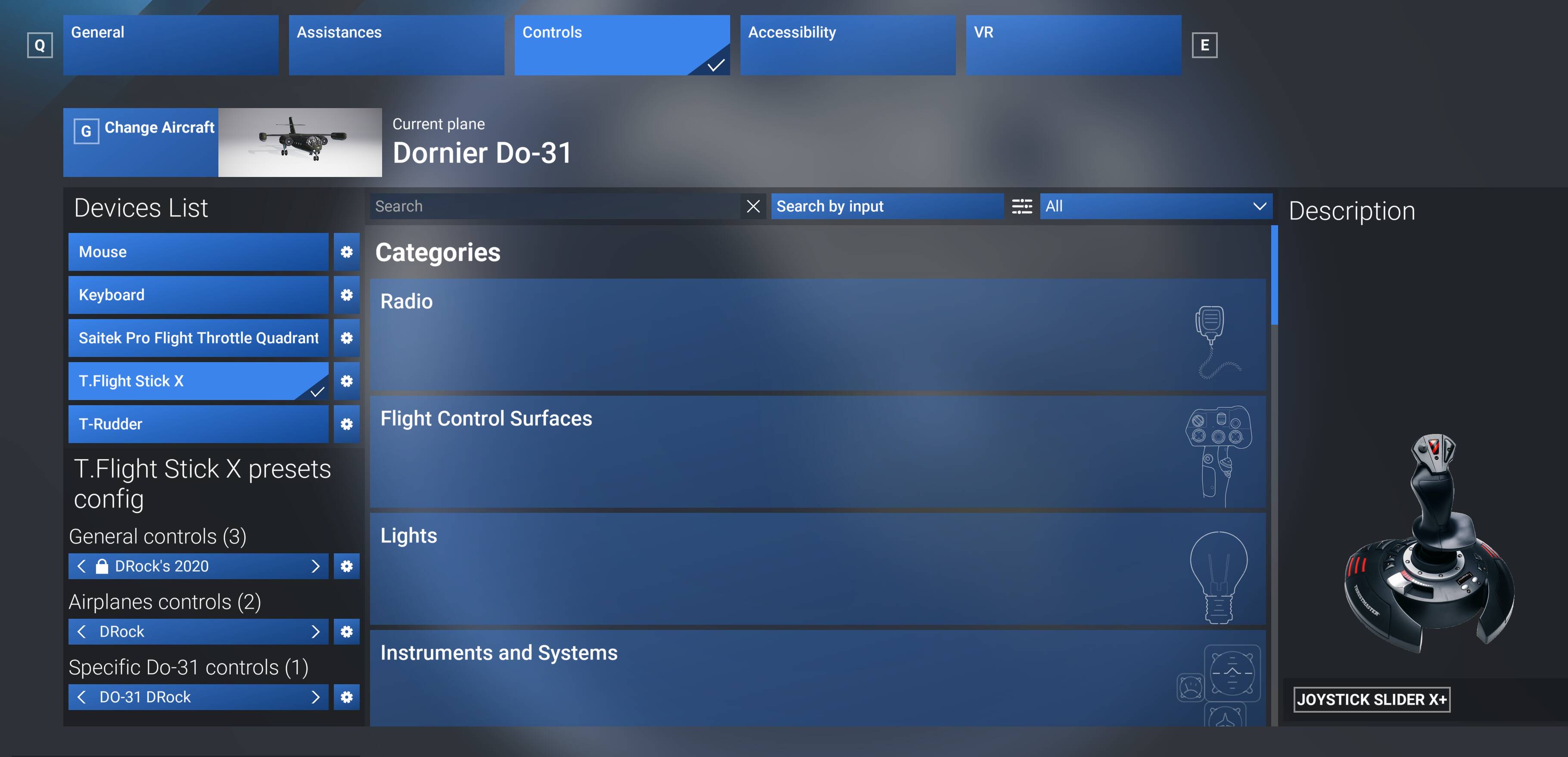 I thought the “General Controls” profile was for all aircraft, with “Airplane controls” profile for all airplanes and “Specific” profiles were for a specific aircraft. With the Specific profile, taking precedent over any conflicts in the airplane or Genral settings? Is is incorrect? If so, what is the benefit of having this three tier system when you have to modifiy the upper layers for every aircraft? For example, I use a Bravo Throttle quadrant. I have a profile for single, multi-engine GA and airliners. I expect to use the single engine profile for a C172 and SR22T, with any minor differences addressed in the C172 or SR22 specific profiles. Is this incorrect? If not, then I think DR Rocks question remains unanswered, i.e., how can he modify a setting in the plane specific profile so that it overrides the General Aircraft profile when flying (in this case the Do-31) but does not modify the General profile for use on other aircraft (eg P51)?