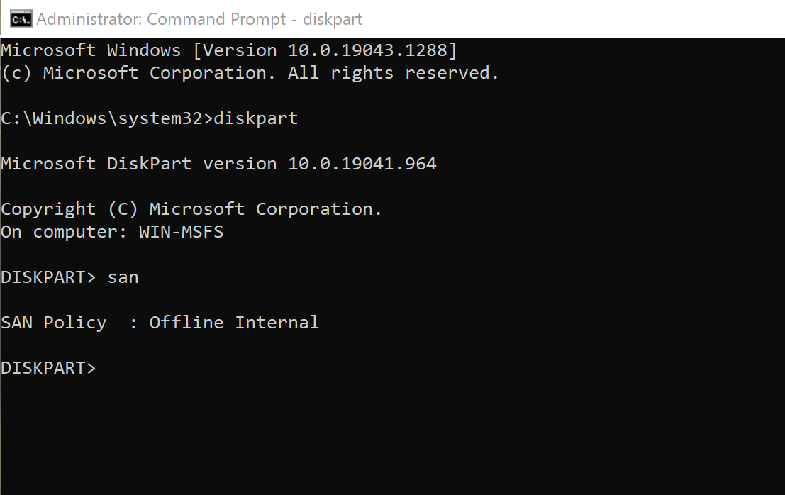 executing diskpart and san results in