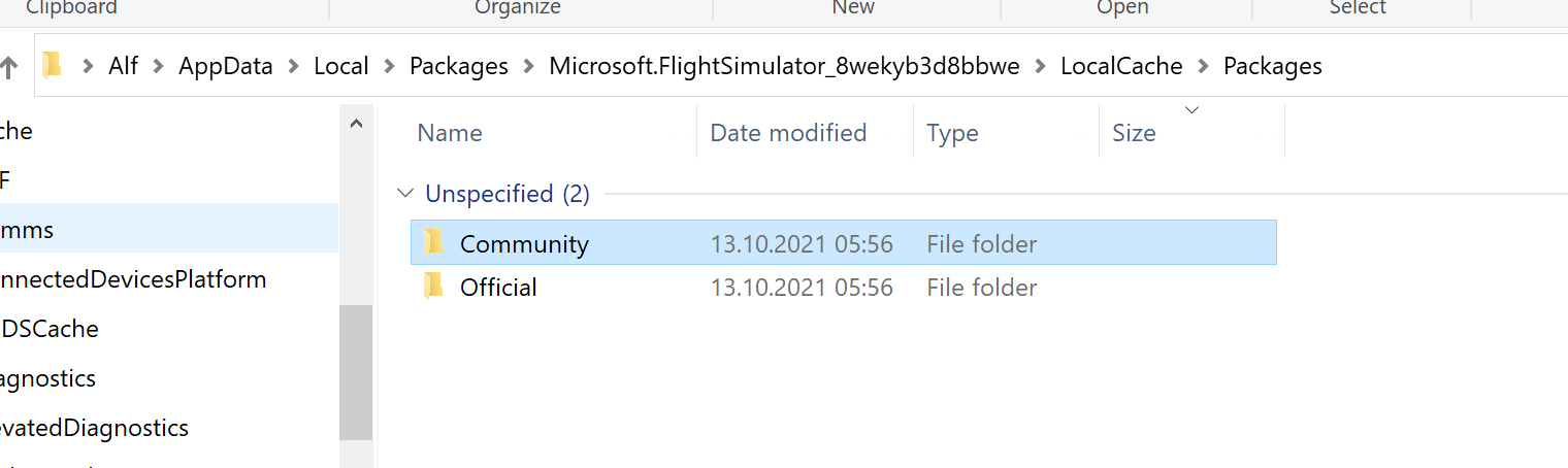 “C:\Users\Alf\AppData\Local\Packages\Microsoft.FlightSimulator_8wekyb3d8bbwe\LocalCache\Packages” and not under “…\Roaming.…”.