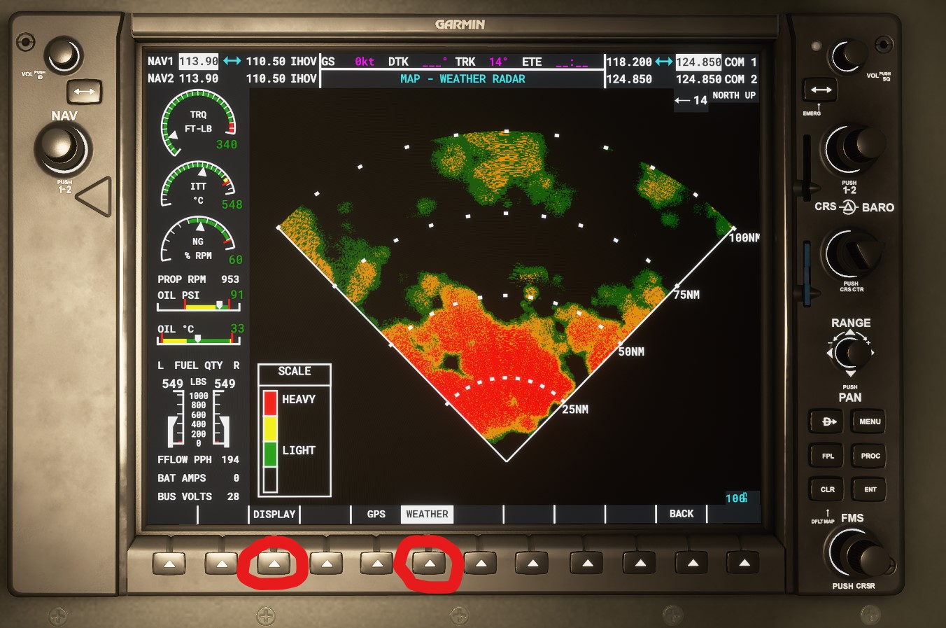 Display on the screen pictured above will change between GPS and weather on the MFD, and Weather will let you switch between a horizontal and vertical display. Vertical also kinda sorta works for terrain avoidance if you’re doing dumb things because hills leave a shadow in the bottom of the display.