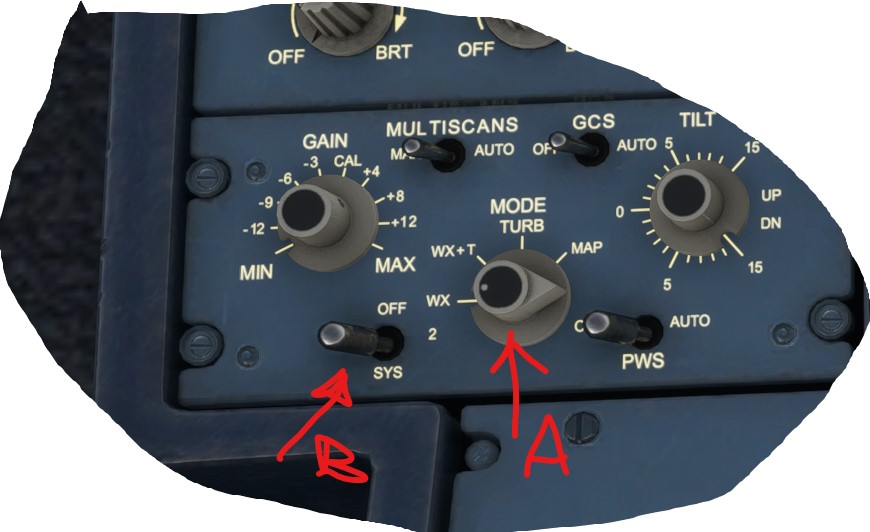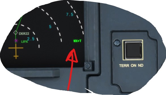 On default A320 turn the knob (A) to WX+T then the switch (B) to the right and back to left.The weather radar will show-up on the FD . See 2 attached pics