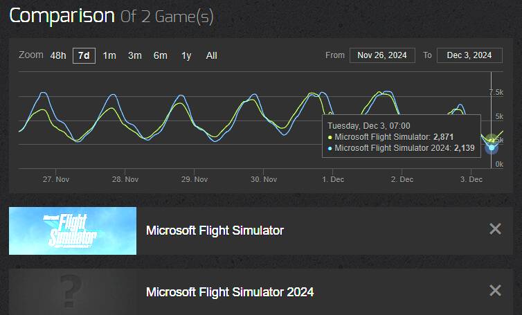 The amount of people playing FS2024 on Steam is dropping day by day. Since Saturday more people are playing FS2020 than the new one. And Asobo call it a success. ![]()