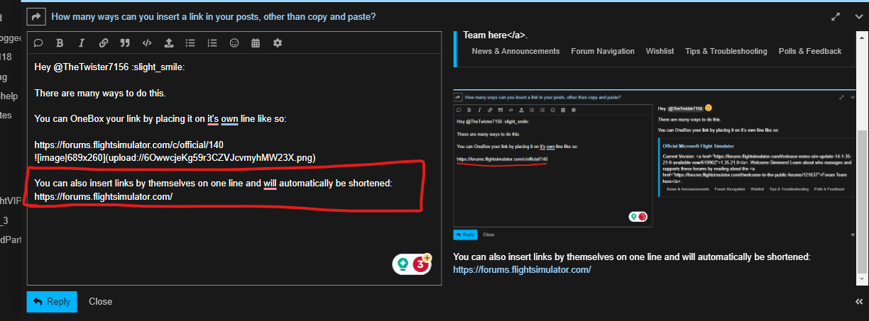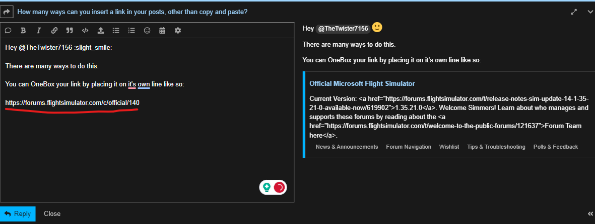You can also insert links by themselves on one line and will automatically be shortened: https://forums.flightsimulator.com/