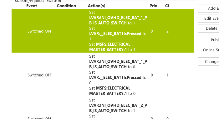 I tried in several ways to assign the batteries of A320 neo to my overhead using SPAD. I even tracked events using event monitor but without success either. Currently this remains the only pushbutton that I still have no success to configure (Fire tests and secondary buttons look inop). Someone knows how can I do that? Please could you give me an idea of how to call this commands using the simconnect?