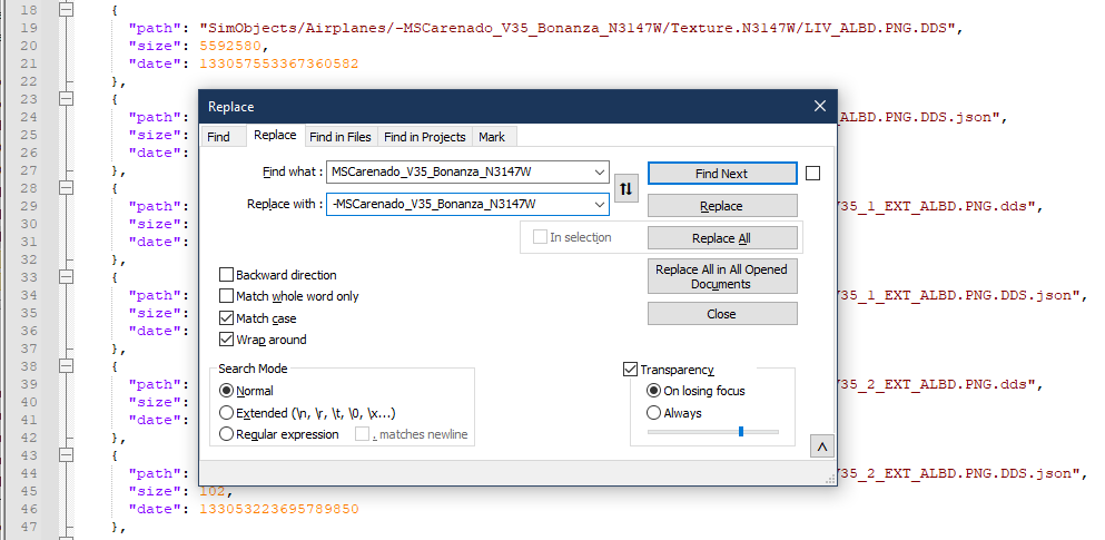 So here’s how to set a default livery. Within the livery’s folder, go into SimObjects > Airplanes, and rename whatever the folder is named here to start with a “-” so it will sort to the top of the list of other names. After doing this though you have to edit the layout.json file in the livery’s top-level folder to also update the folder name there. This can be easily done using the “Replace” feature of a CTRL+F search in a program like Notepad++
