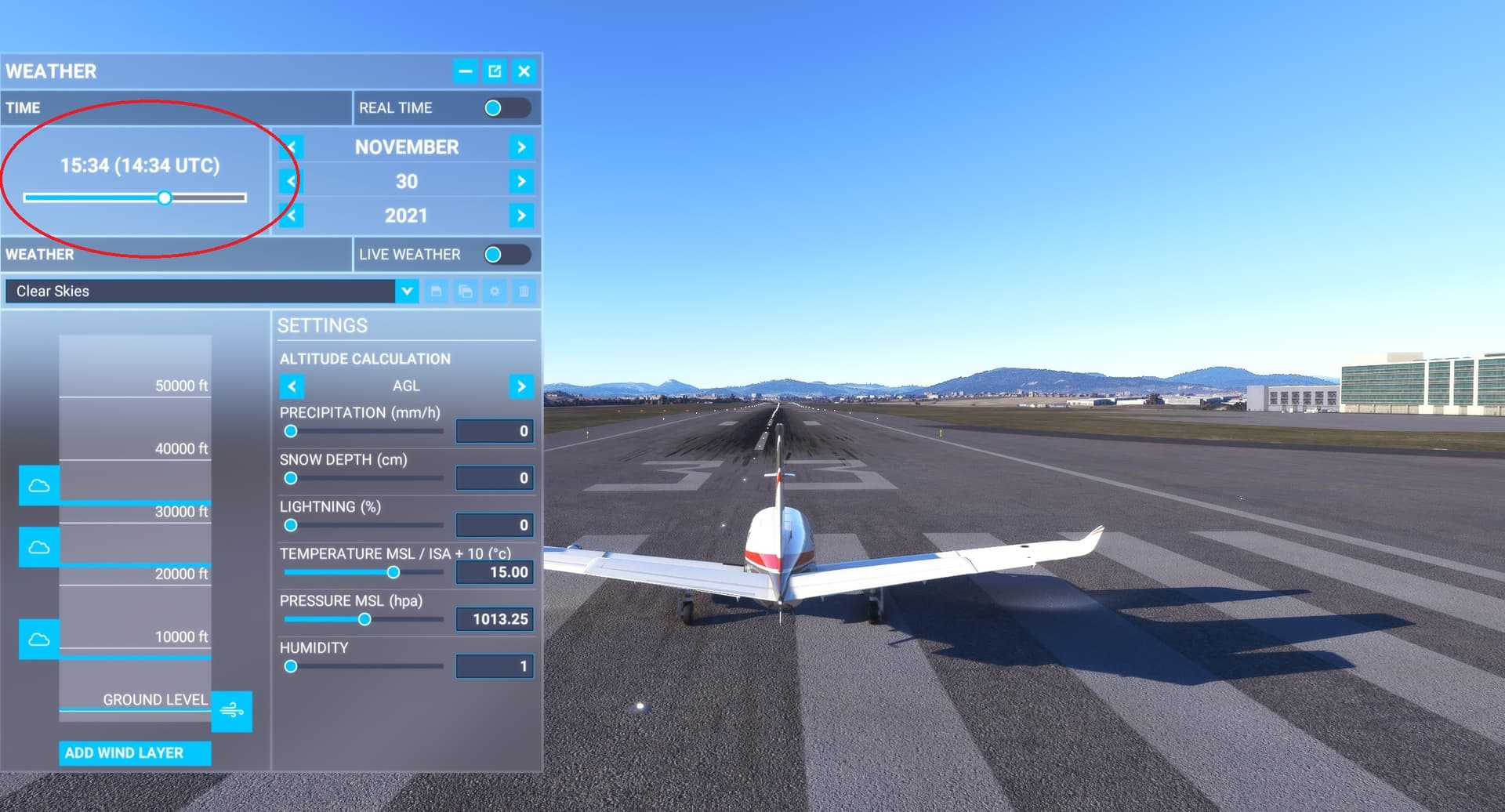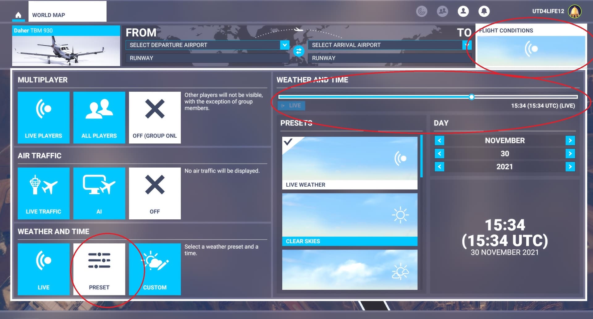 Altneratively you can set the time before you start your flight by pressing the 'Flight Conditions box, then selecting ‘Preset’ or ‘Custom’ and adjusting the time