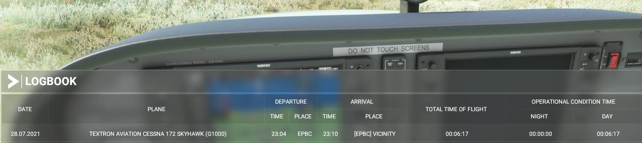 If you’ve landed your plane, and parked it up where you want, you can end the flight manually. After going back to the menu you can see the flight in your logbook from your profile page.