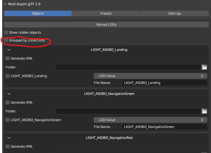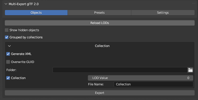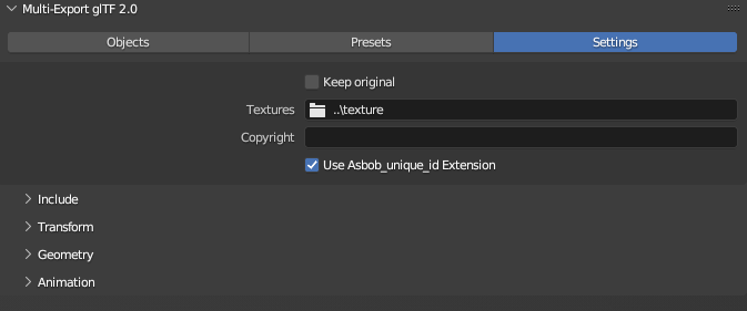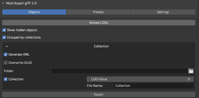 Open your object in Blender, and click “Multi-Export GLTF 2.0” in the right toolbar.