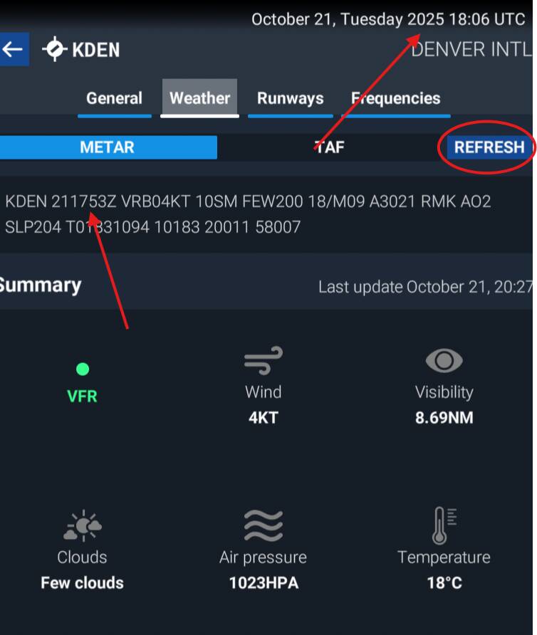 EFB (note the updated (past) time in the top right and the METAR itself)