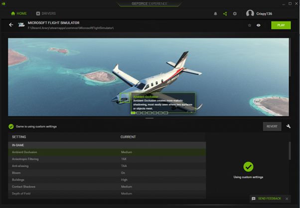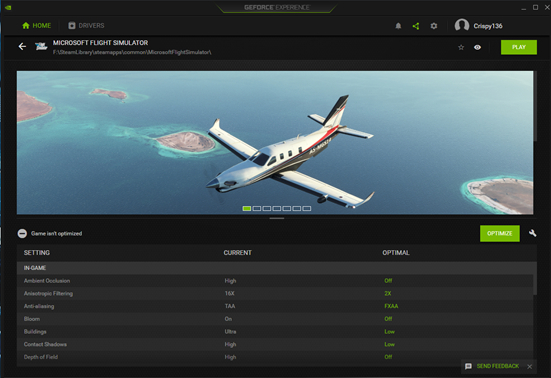 Then Click “Play” and Nvidia Experience will start MSFS up for you to test the changes.