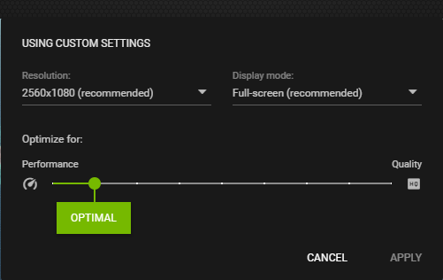The green dot just above “Optimal” is a slider you can move left or right to change all the graphic setting in MSFS in one hit. As Nvidia has 9 presets, it can fine tune a little better than just using the 4 presets within MSFS.
