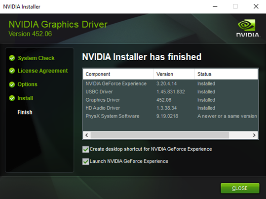 The installer will remove any existing drivers and install the latest version you have downloaded. Let it do its thing and after a while the installer will advise “Nvidia Installer has finished”.