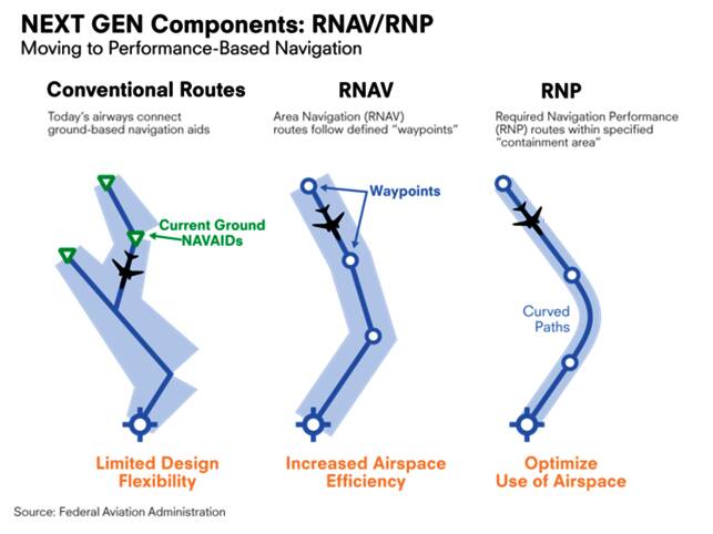 This is the drawing you will often come across explaining the difference between conventional navigation, RNAV and RNP: