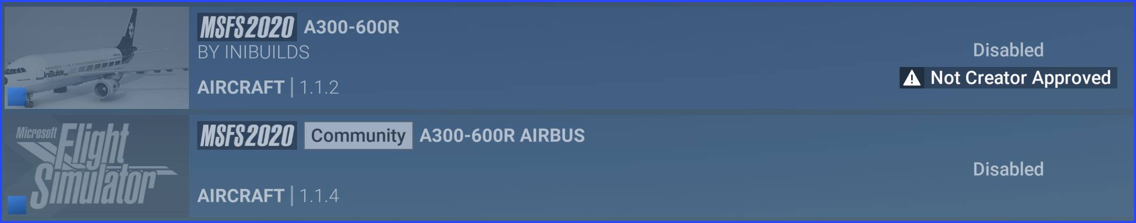Over the last couple of weeks content from the MSFS 2020 Marketplace have received updates to certain content to support MSFS 2024. But I can’t figure out how to get the content to MSFS 2024. The Streamed versions are still the older unsupported versions. I tried placing the updated version into the MSFS 2024 community folder, it shows up in My Library but it remains disabled without any option to enable it. Here is an example with the inibuilds A300, version 1.1.4 should work in 2024. The same goes for the recent updates to the Shorts 330/360 aircraft from Blackbox Simulations.