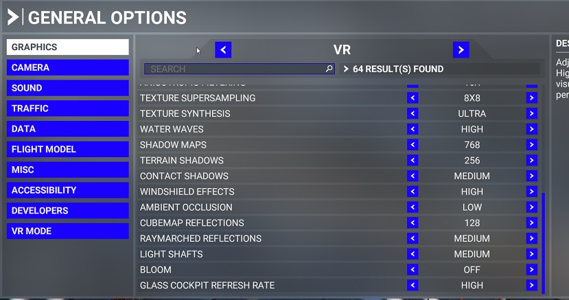 I need to play with it more, but I was getting it to where I liked it except for coming across some terribly non-optimized airports by ORBX. I mean, I run Aerosoft Brussels smooth as glass in VR at these settings then go to ORBX KCRW West Virginia and it’s a slideshow. Argh!