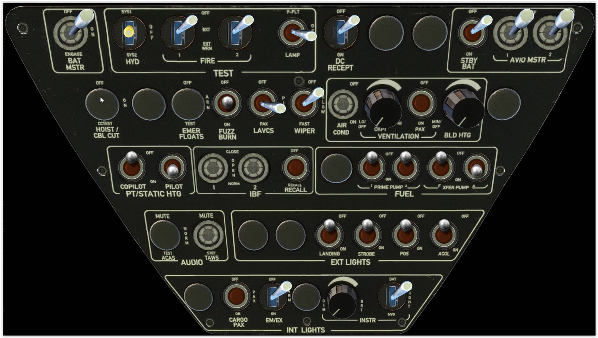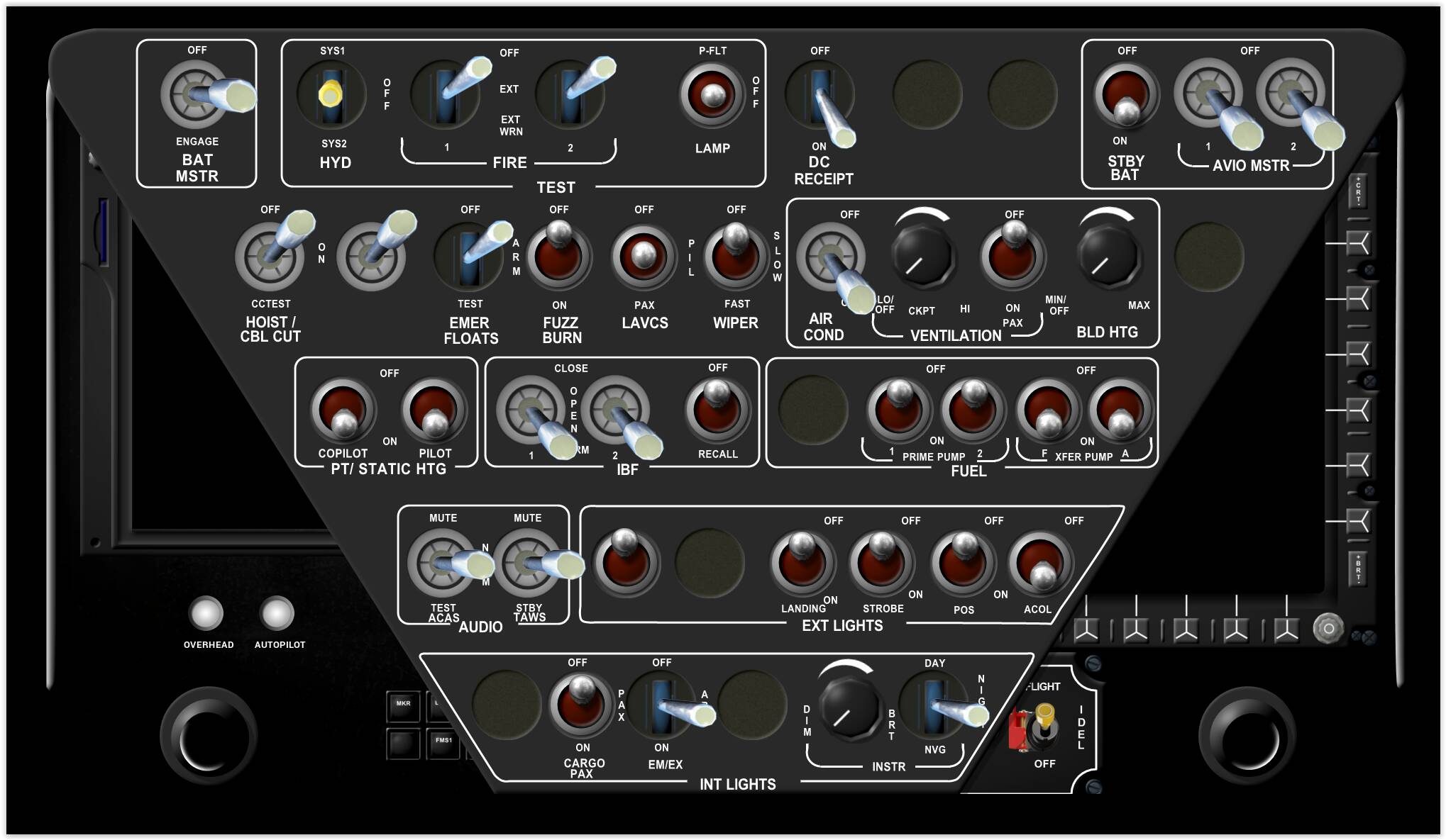 Overhead : Almost all switches work (exception HISL due to an LVAR and HEVENT Error) , depending on setup some switches are hidden (this currently works for Emergency Floats, Hoist, Cargo Hook, ACAS, HTAWS, other will follow)