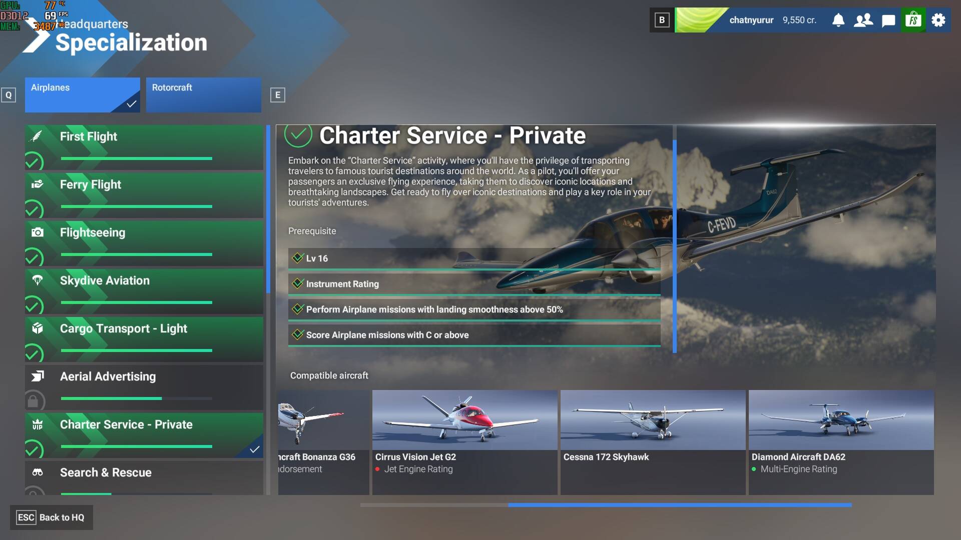 as you can see here, I have fulfilled the conditions for diamond aircraft, but I still don’t have any charter mission or any mission with this plane.