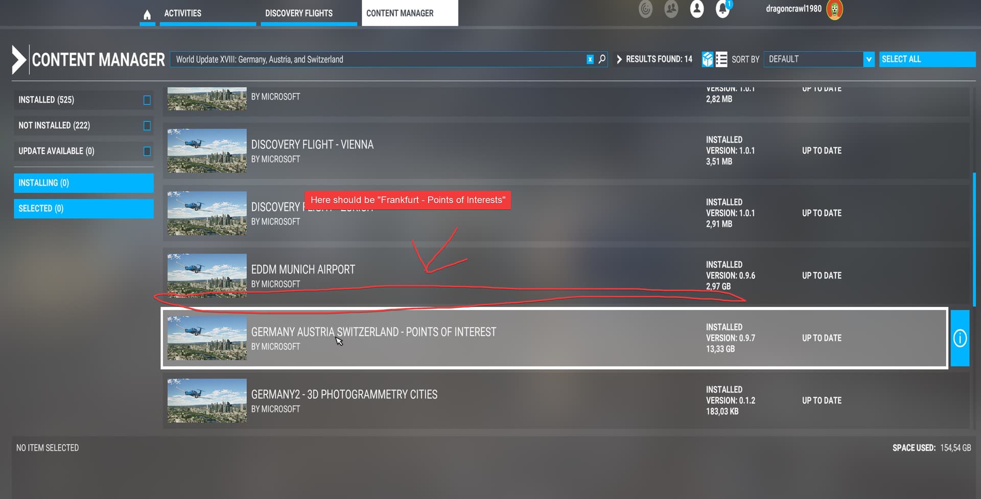 I installed nearly everything and I can enter every discovery flight except Berlin and Pennine Alps which both want me to install the mysterious “Frankfurt - Points of Interest” Package. The other locations in Germany (Frankfurt, Freiburg), Austria (Vienna) and Switzerland (Zurich) are accessible in the Discovery Flights.
