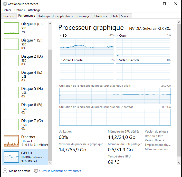 I attach some screenshots. Everything is in french language (sorry !). The taskmanager pic corresponds to a flight over Paris, altitude around 400 feet and very close to the Eiffel tower. Plane: DA62,