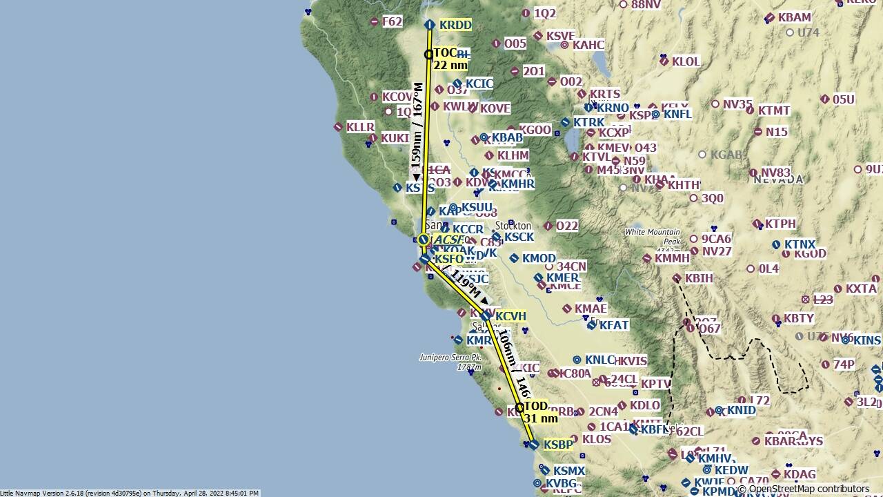 This week we fly from Redding Muni (KRDD) to San Luis County Rgnl (KSBP).