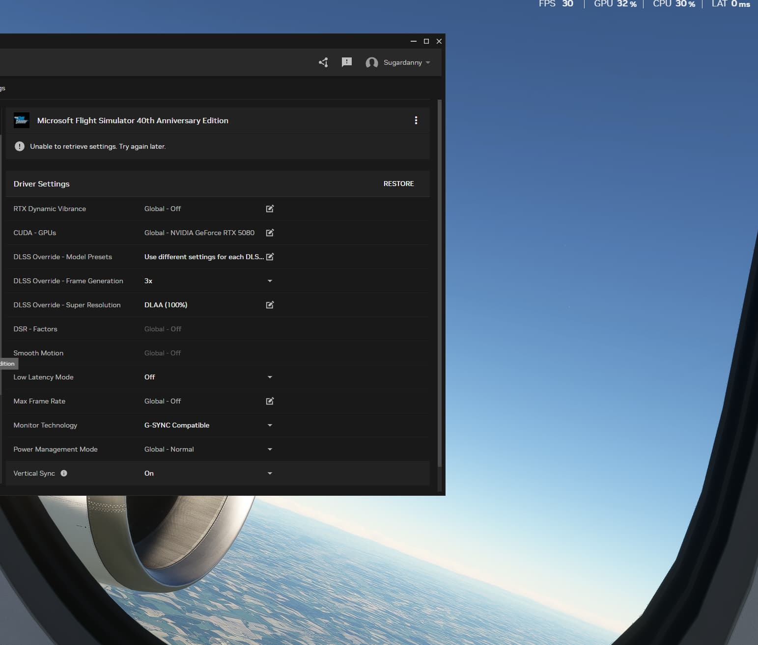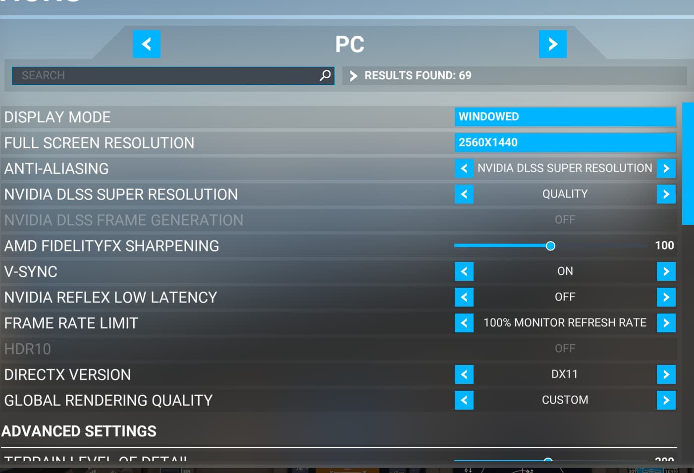 In Developer Mode, I’m seeing around 30-35 FPS. I play on a single AOC monitor at 1440p with a size of 31.5 inches. All external software is disabled—no Firefox or other background programs running. MSFS is installed on a Samsung 990 Pro SSD.