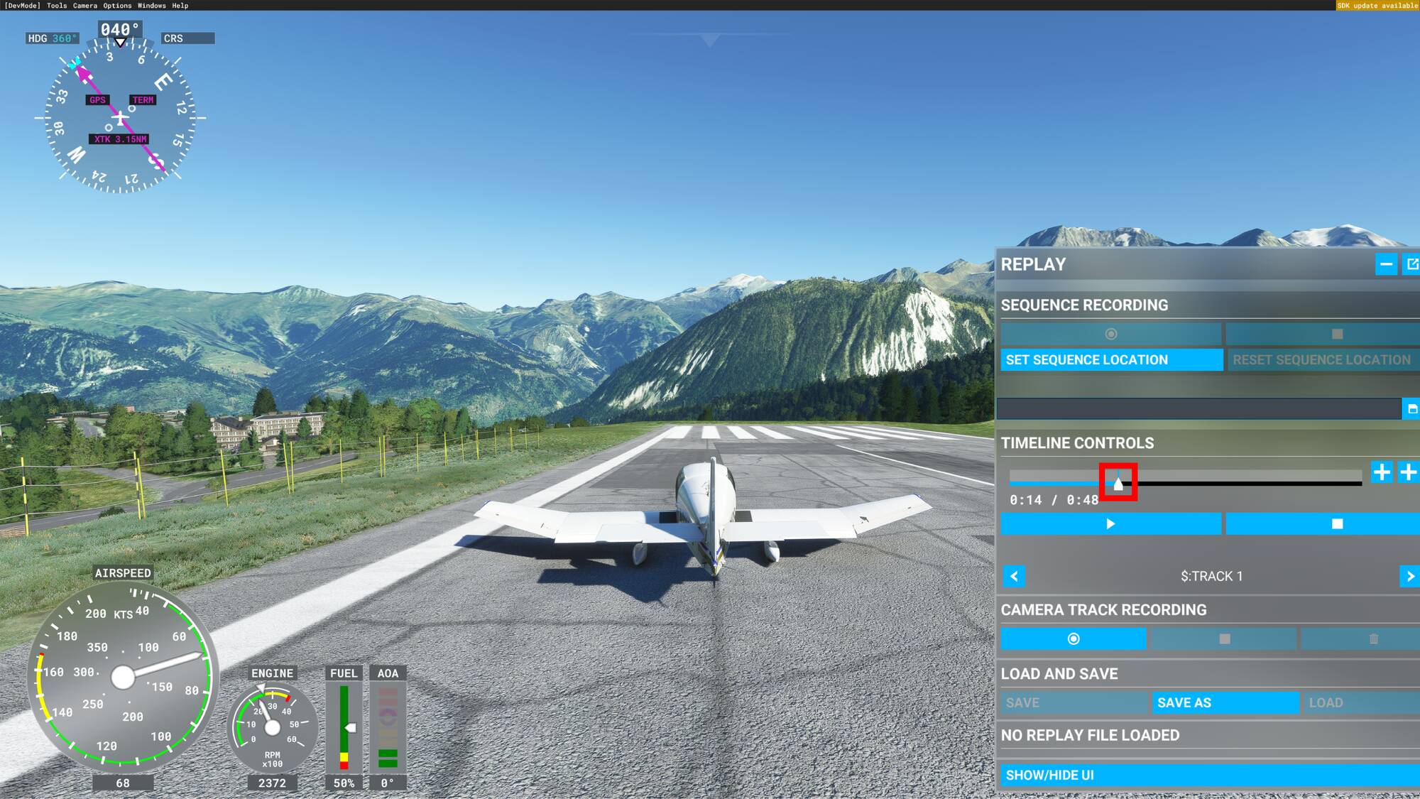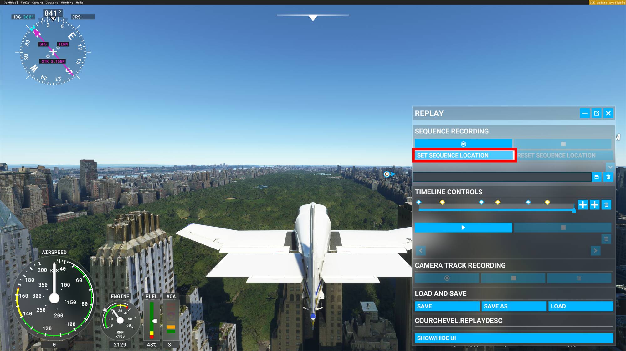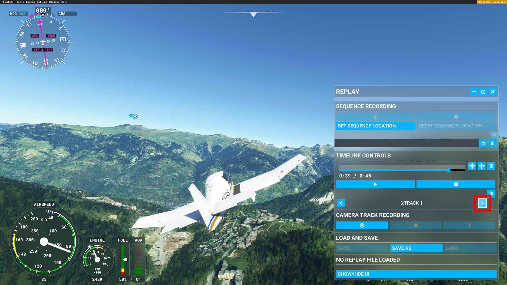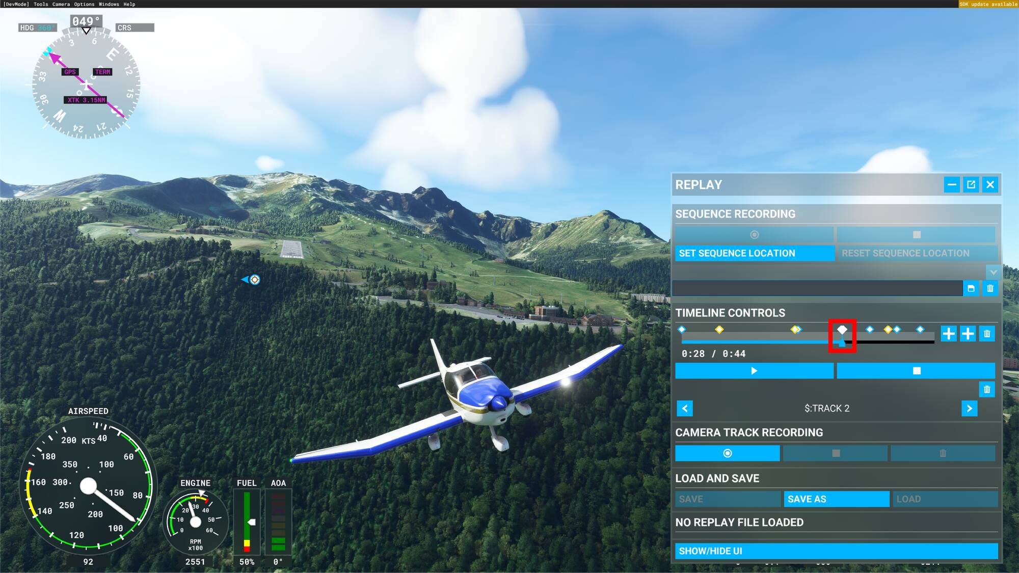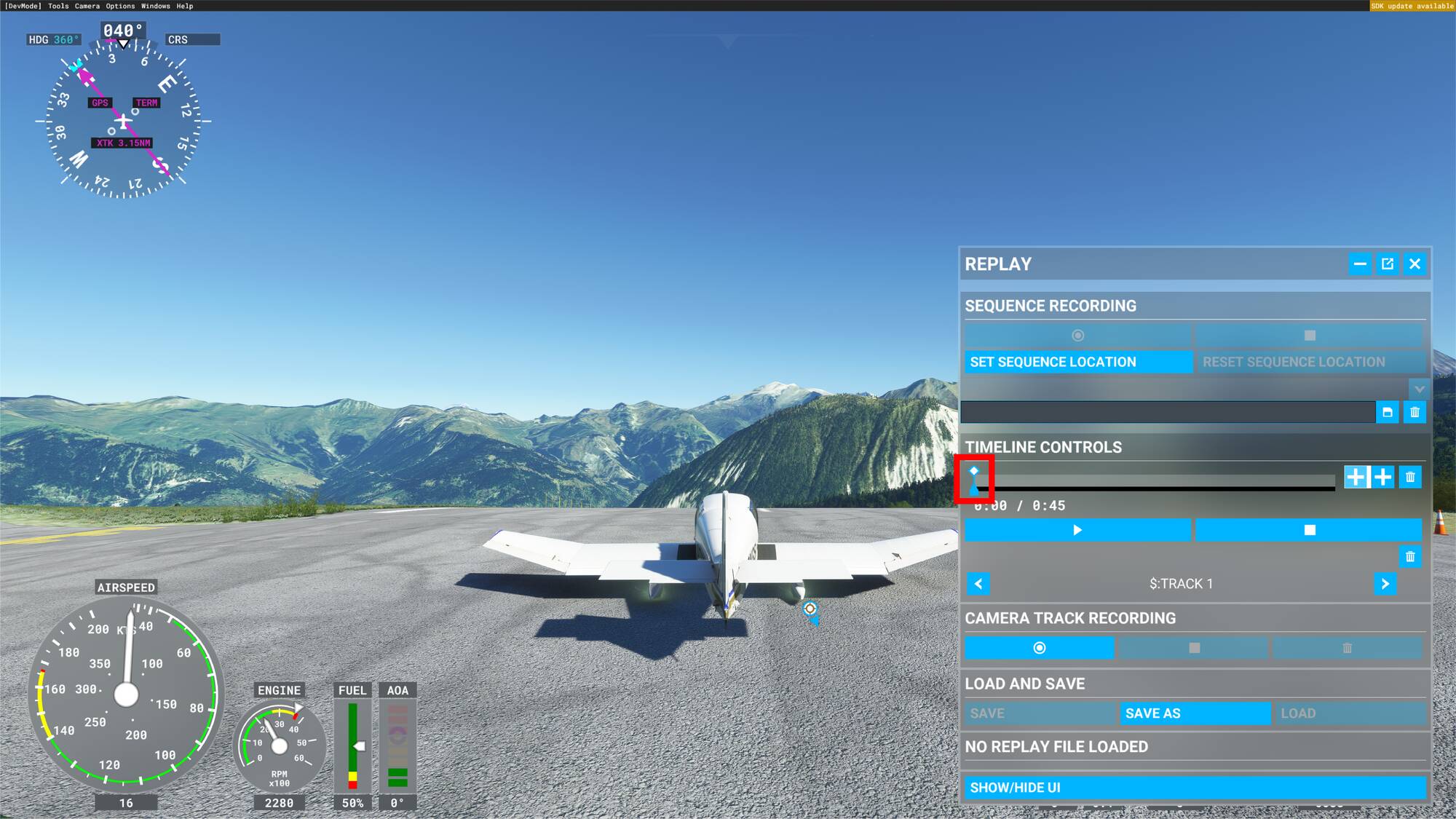 Once you have your recorded sequence (with or without keyframe), you can modify the position of your flight. To do so, you’ll have to activate the slew mode. This is a useful mode for quickly re-positioning your plane.