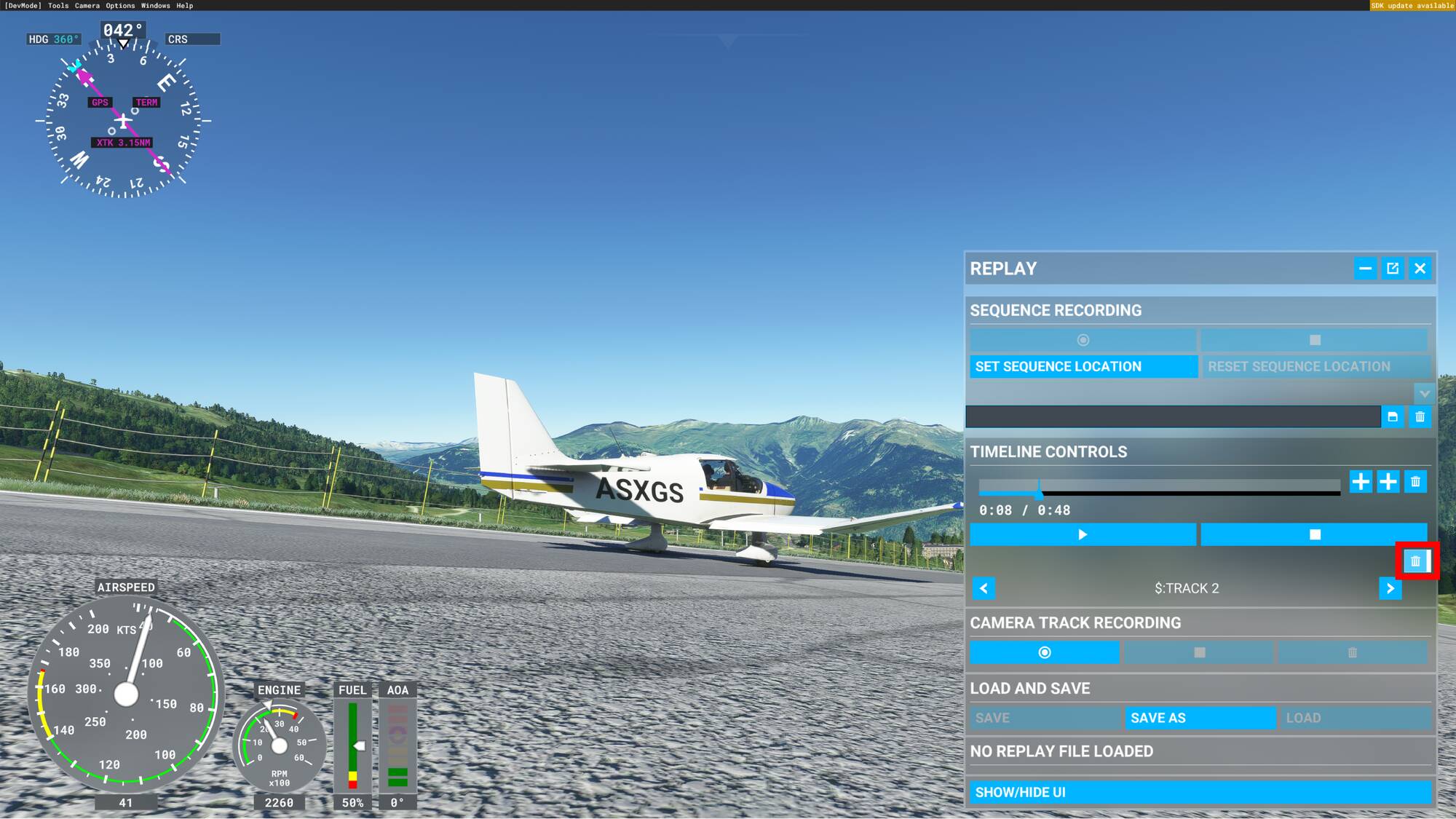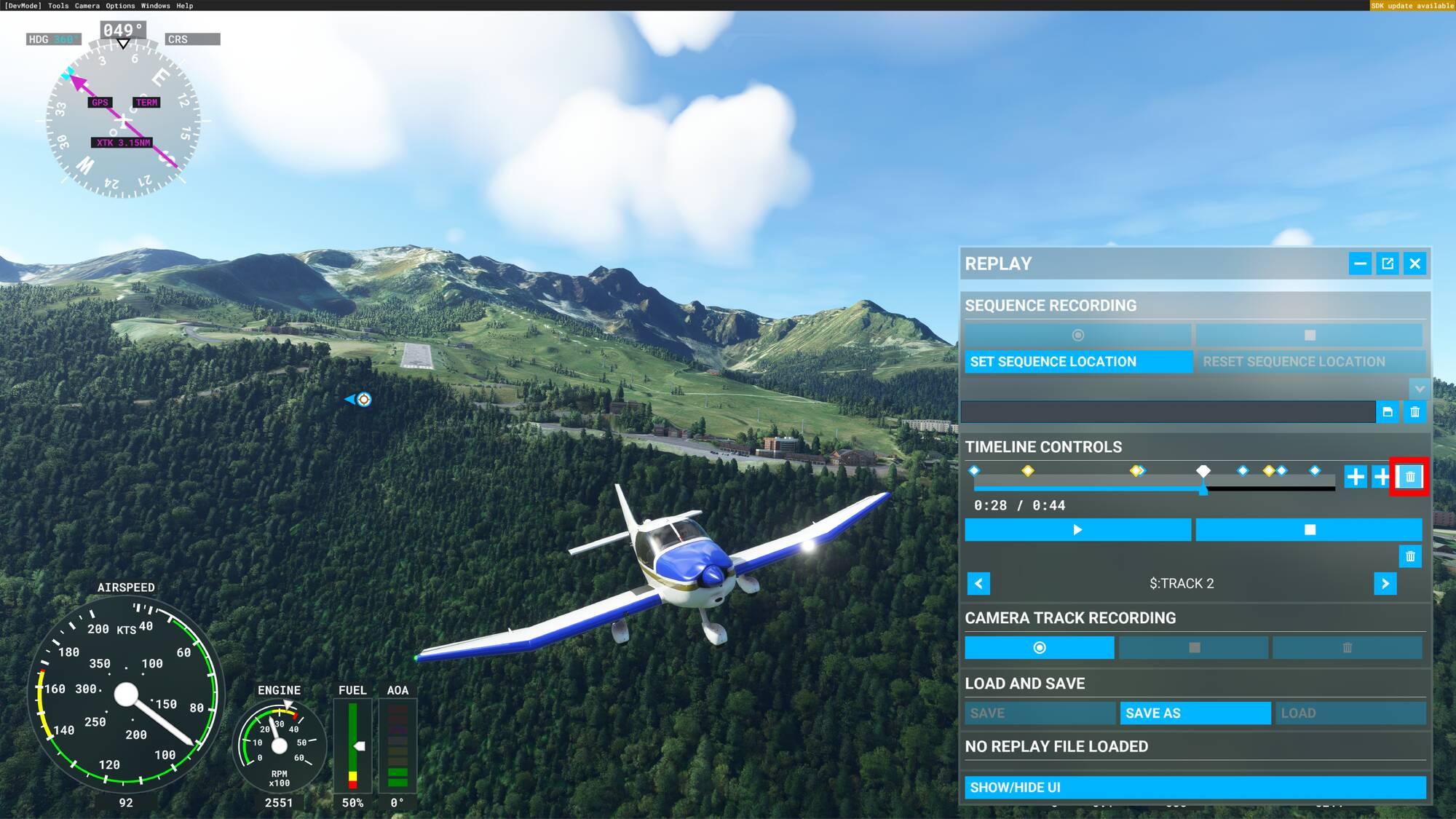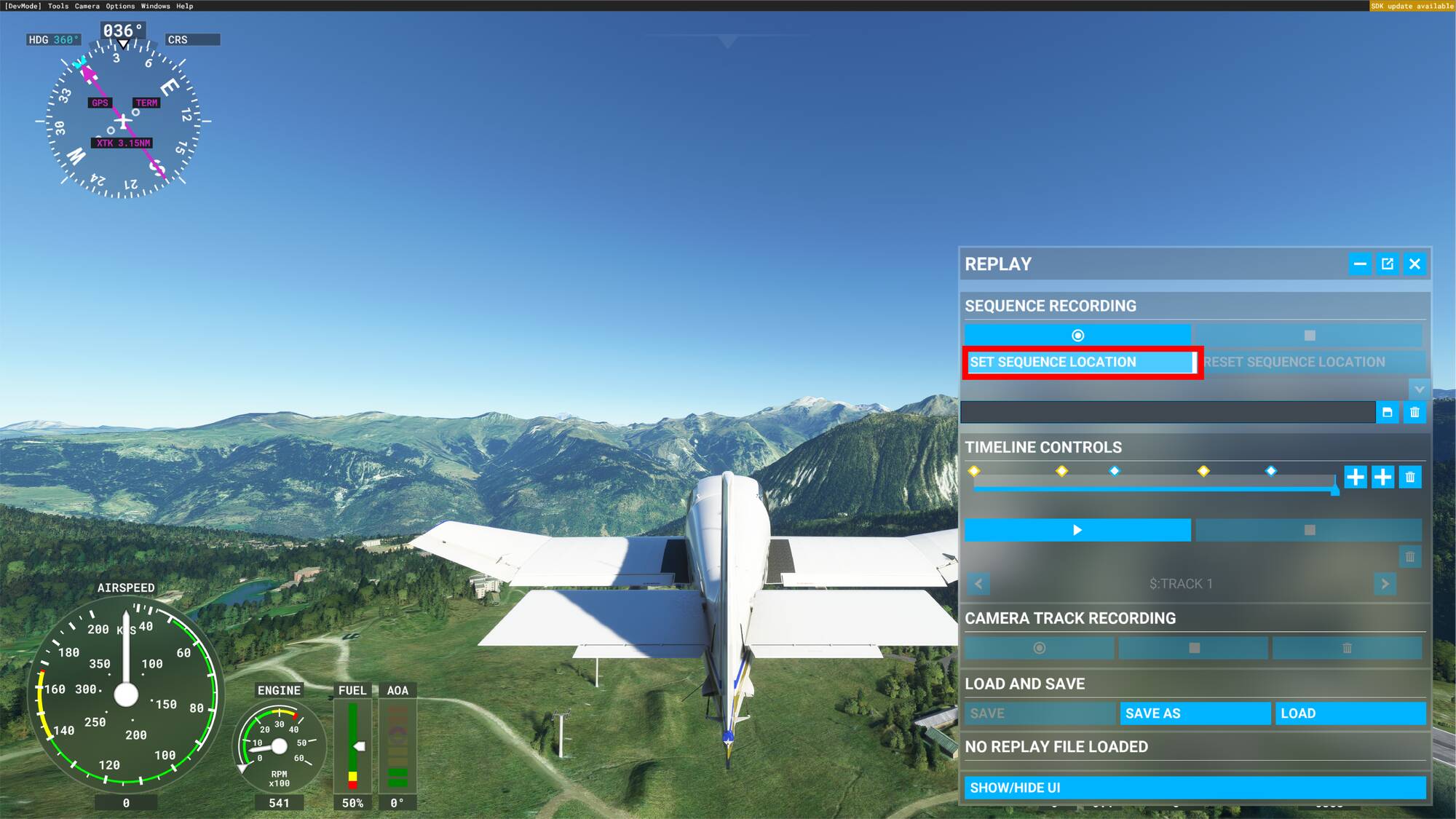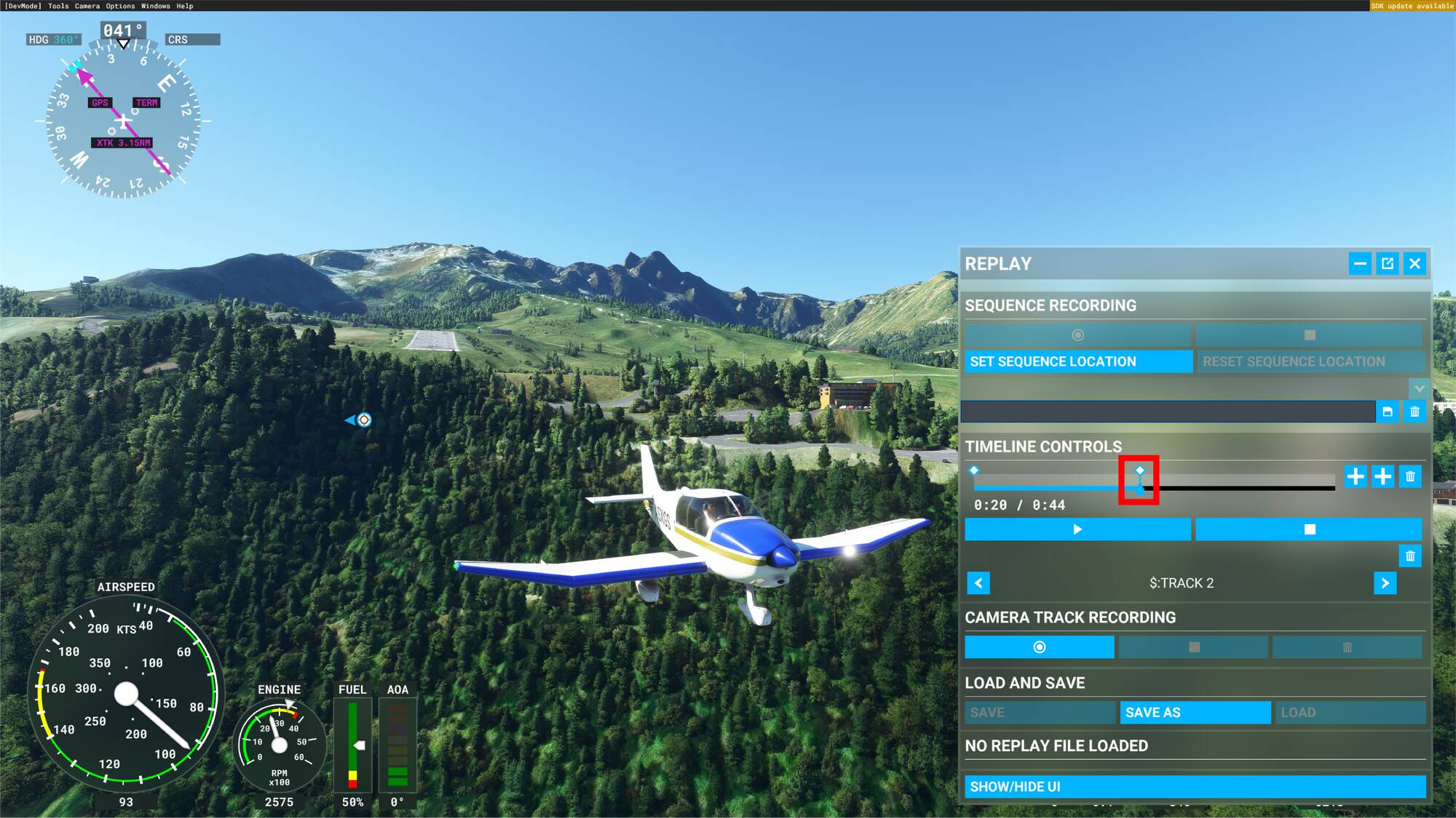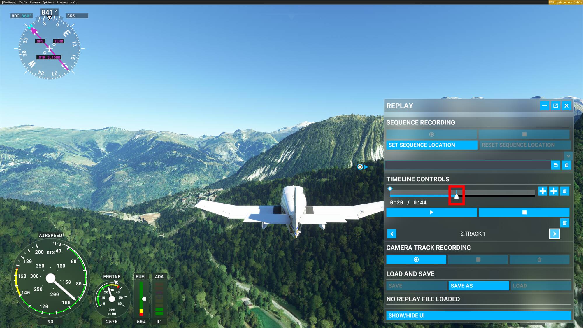 Once you have your recorded sequence (with or without keyframe), you can modify the position of your flight. To do so, you’ll have to activate the slew mode. This is a useful mode for quickly re-positioning your plane.