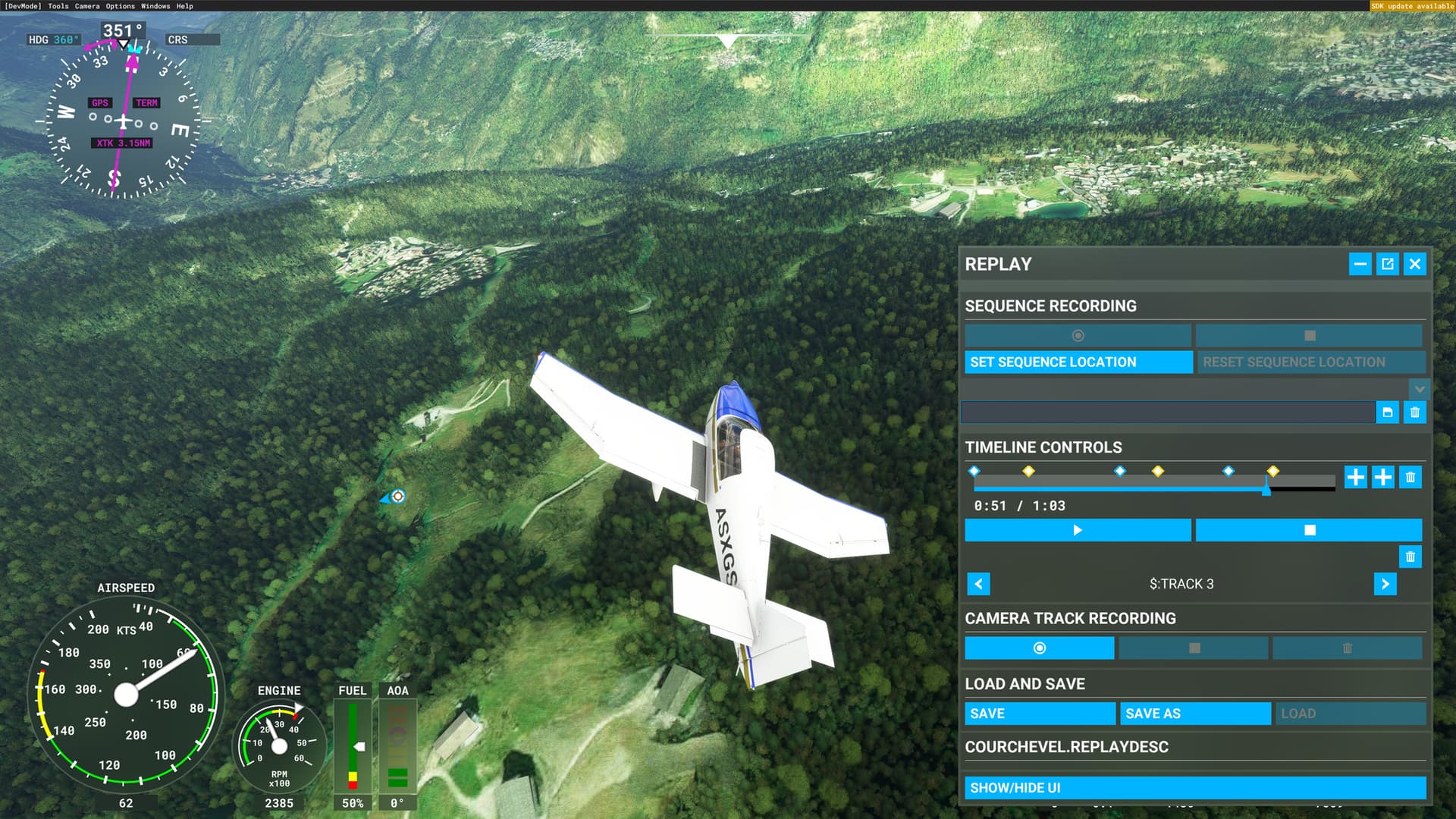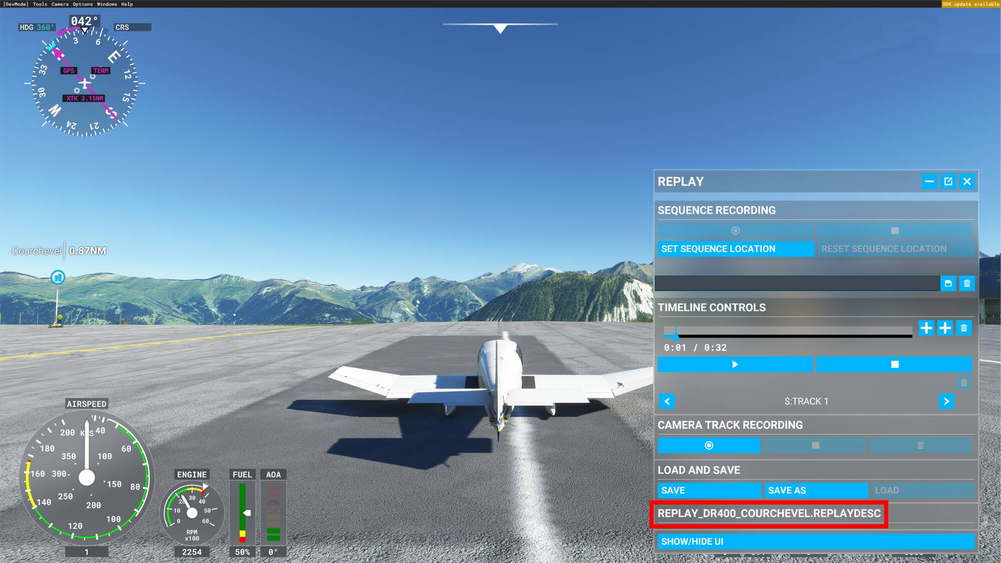 A new replay file has been created with the editing and the plane trajectory from the original replay (courchevel) in a new location.